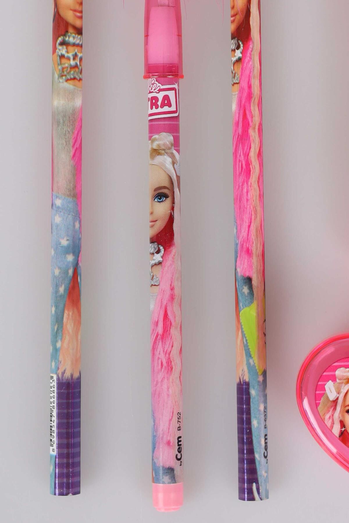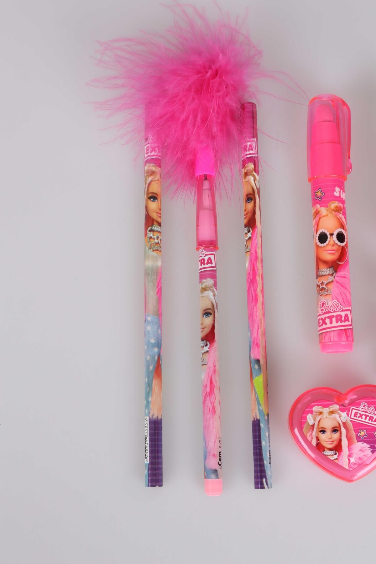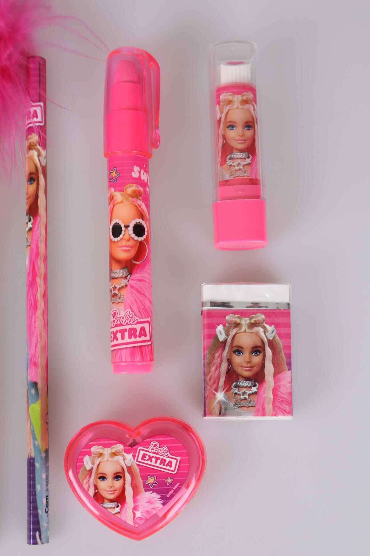 DEKOMUS İLE LİSANSLI BARBIE 7'Lİ KIRTASİYE SETİ 2 ADET KURŞUN KALEM,TÜYLÜ GEÇMELİ KALEM,ROKET SİLGİ,RUJ SİLGİ, VE KALPLİ KALEMTRAŞ SETİ