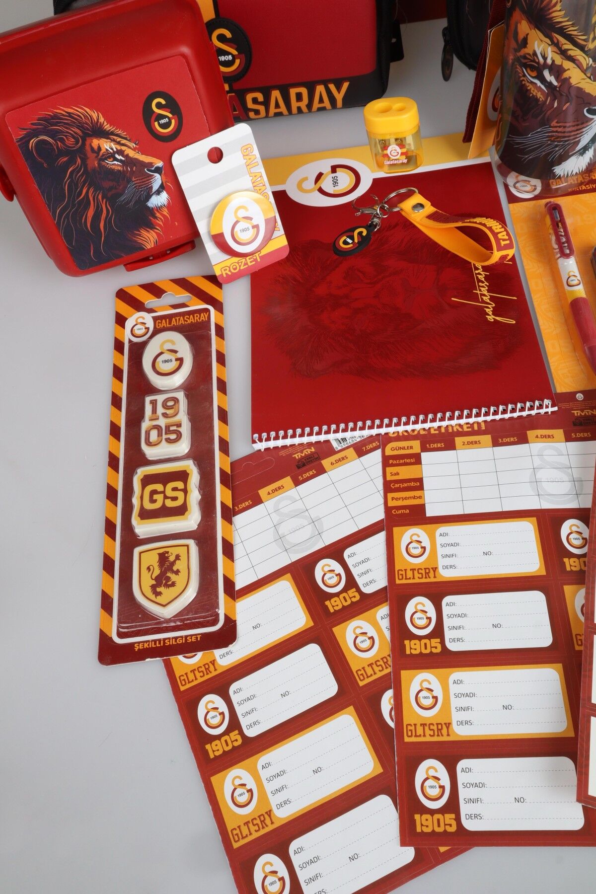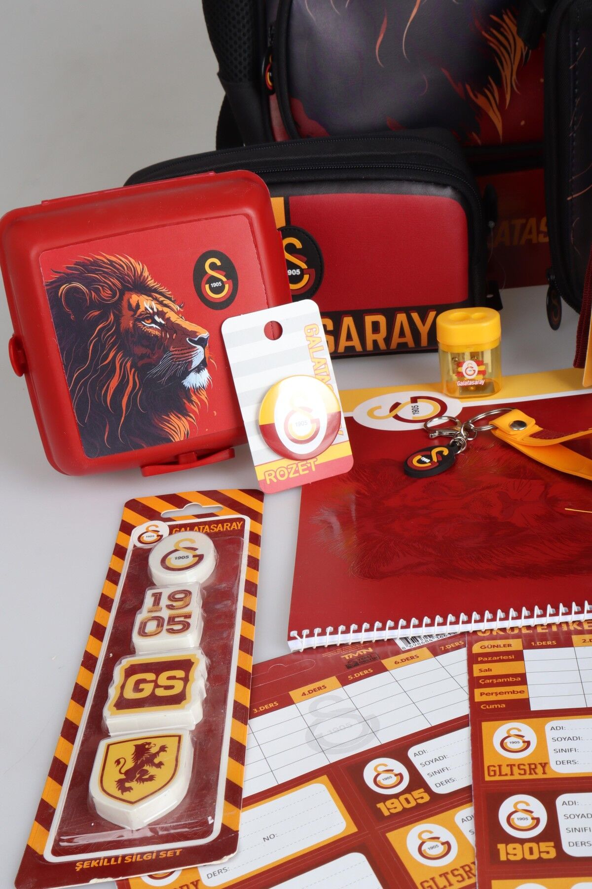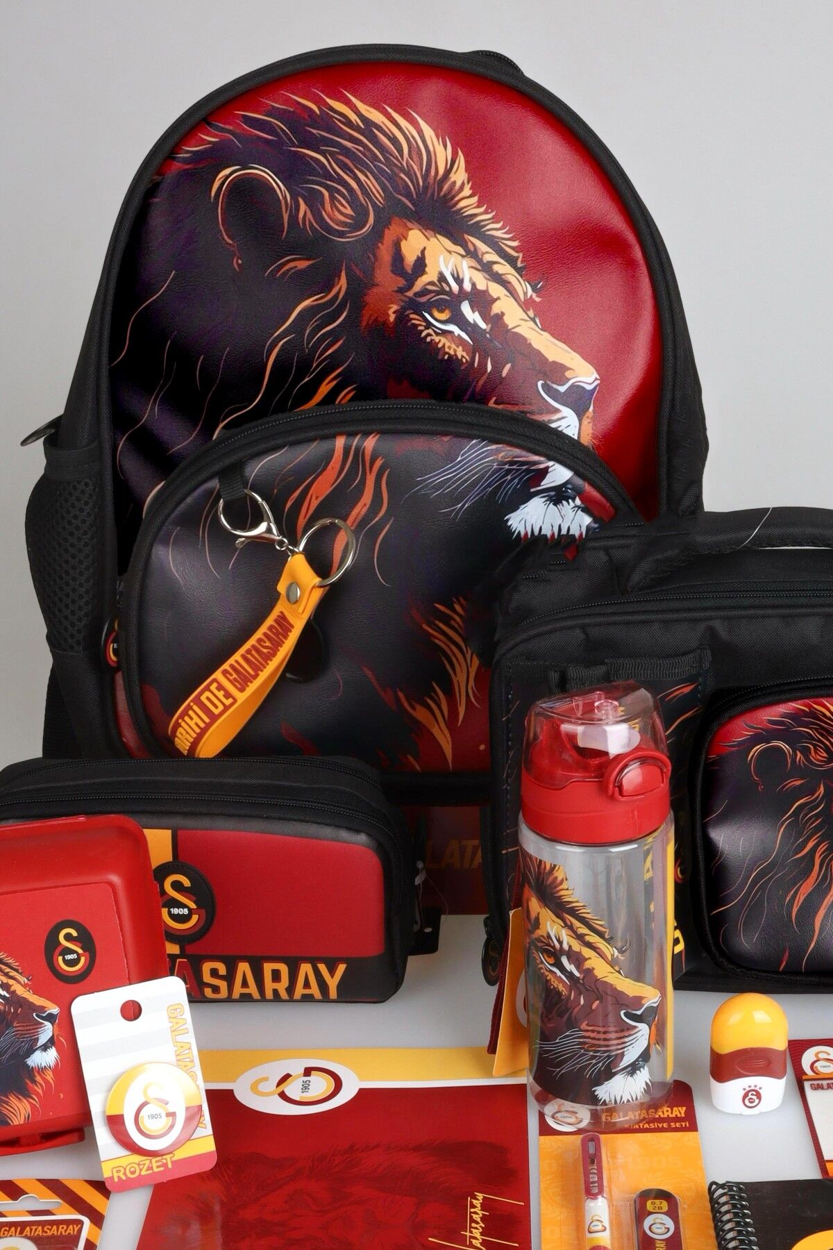 DEKOMUS İLE LİSANSLI GALATASARAY FULL KIRTASİYE SETİ KÜÇÜK BOY 32 CM ANAOKUL ÇANTASI,500 ML MATARA VE BESLENME KABI SETİ