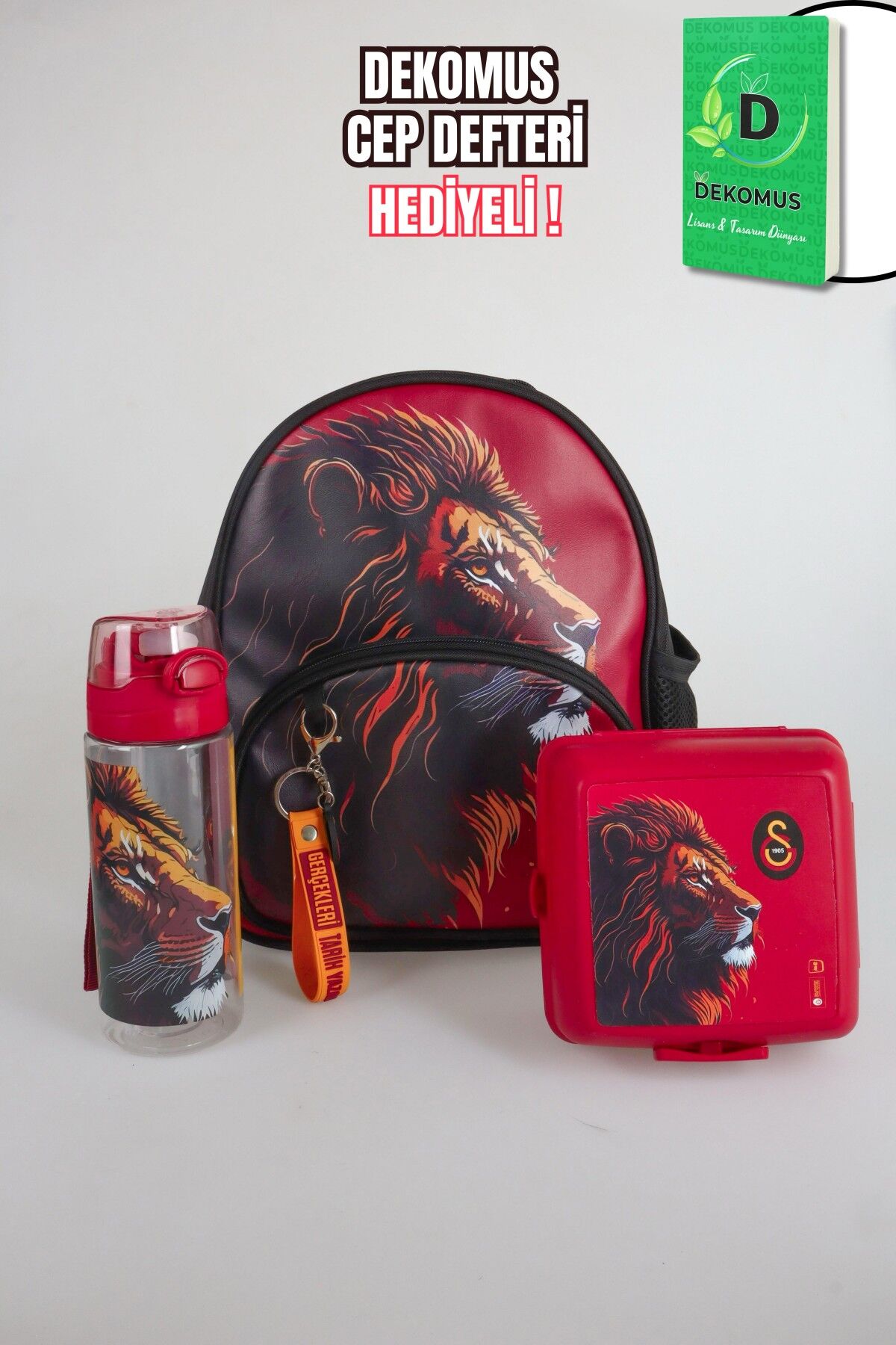 ''DEKOMUS CEP DEFTERİ HEDİYELİ'' LİSANSLI GALATASARAY KÜÇÜK BOY 32 CM ANAOKUL ÇANTASI,500 ML MATARA VE BESLENME KABI SETİ