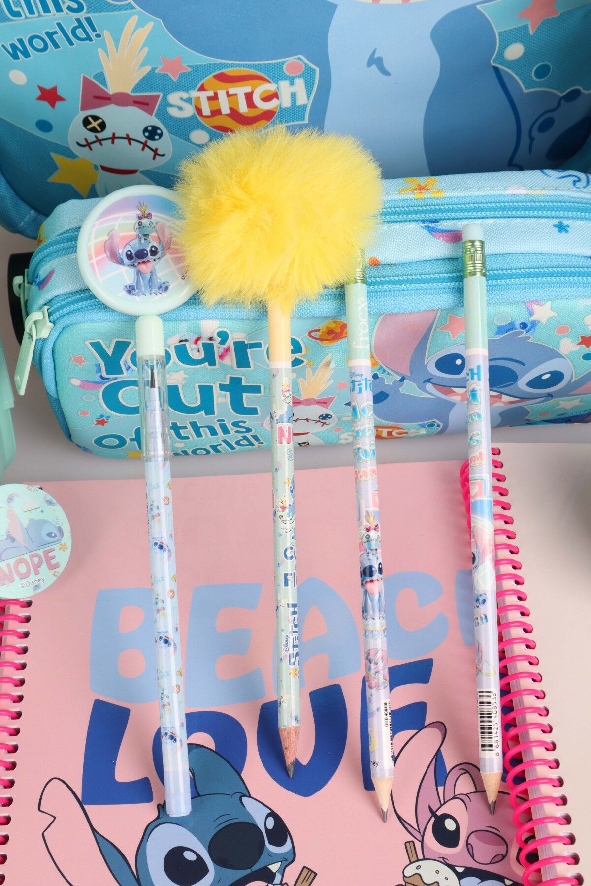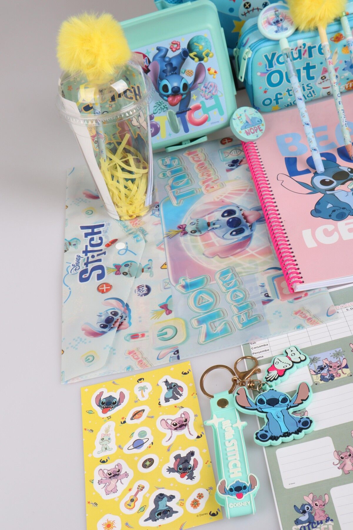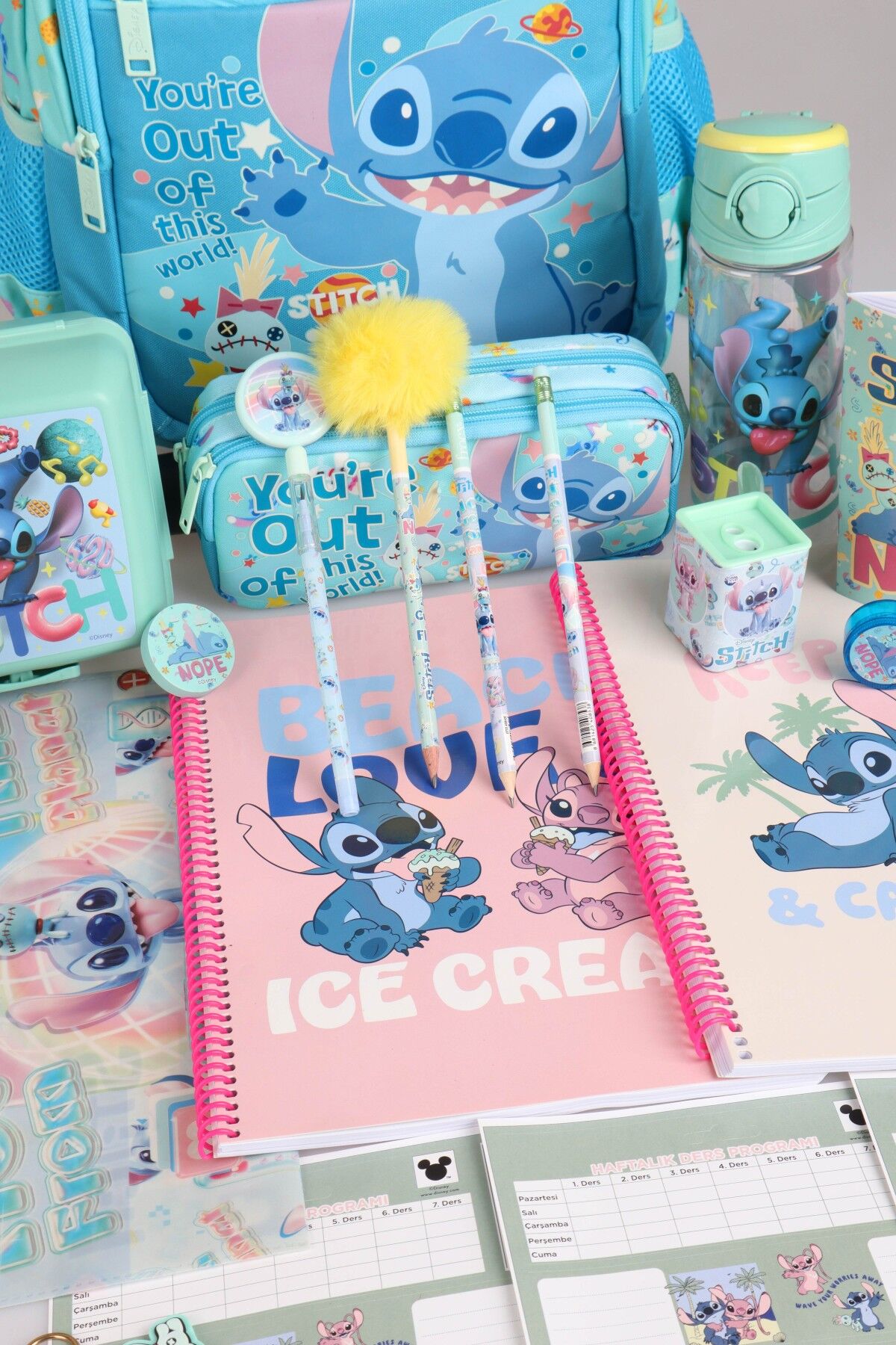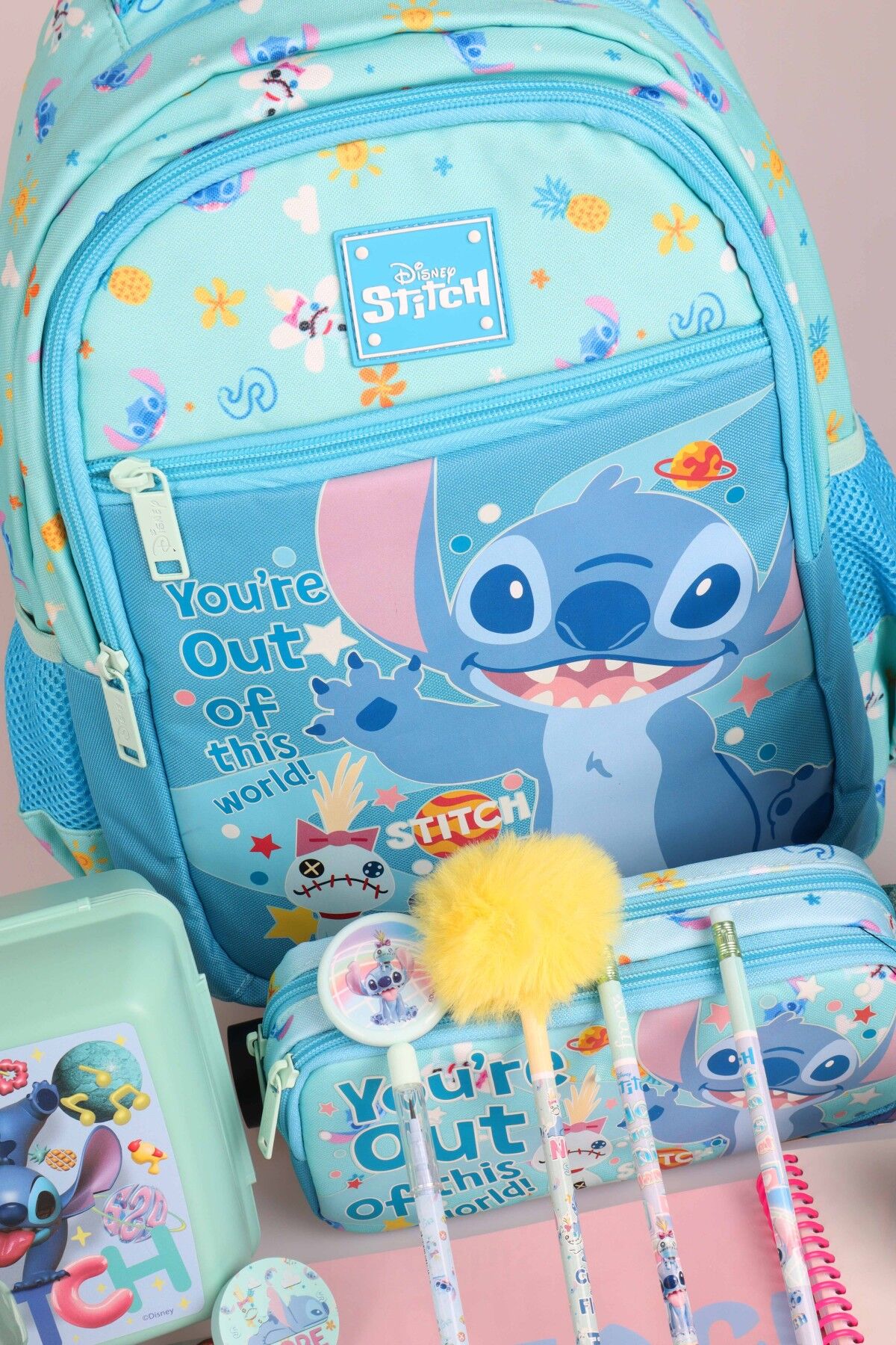 x Dekomus Lisanslı Stitch ''Galaxy Pop Koleksiyonu'' Okul Kırtasiye Seti Okul Ve Kalem Çantası, 500 Ml Matara Ve Beslenme Kabı Seti