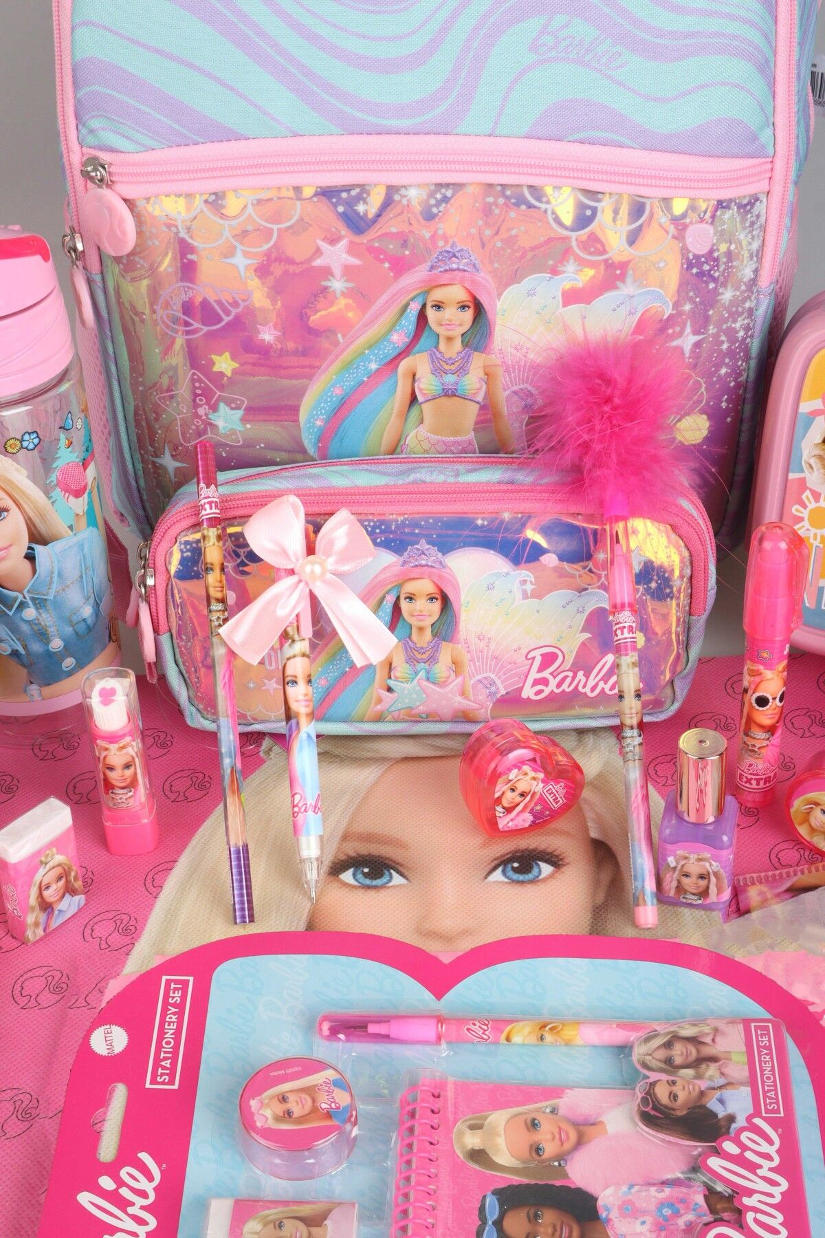 DEKOMUS İLE YENİ SEZON LİSANSLI BARBIE'NİN DENİZ KIZI RÜYASI KOLEKSİYONU OKUL VE KALEM ÇANTASI İLE 500 ML MATARA,BESLENME KABI FULL KIRTASİYE SETİ