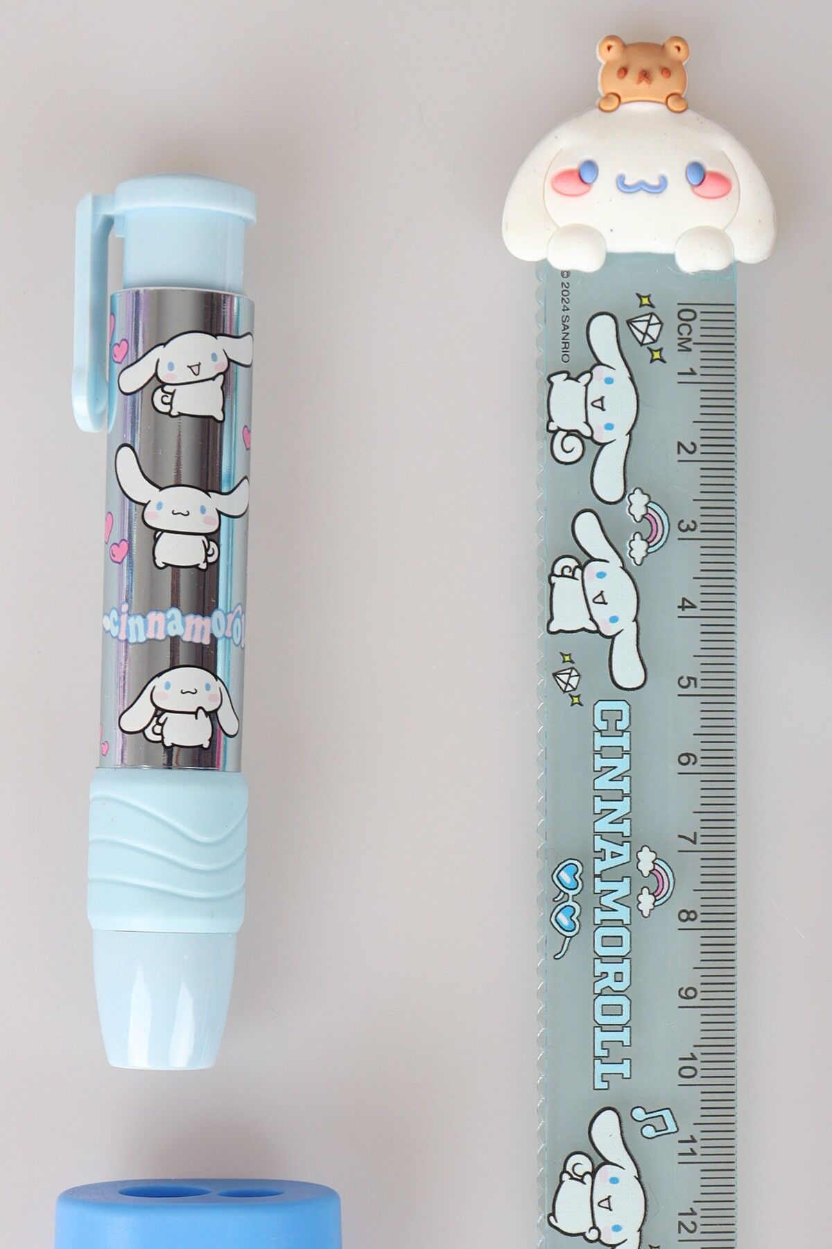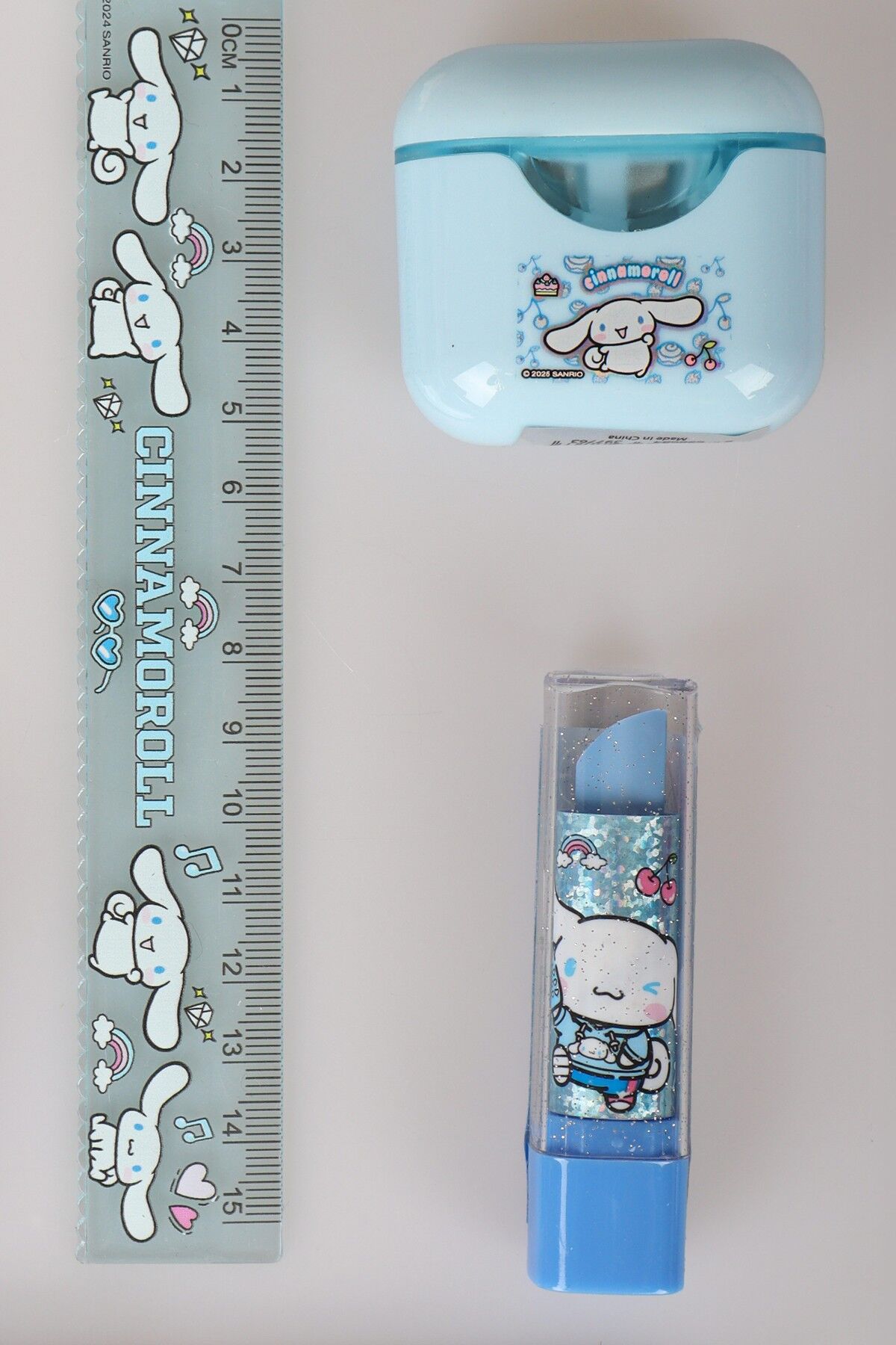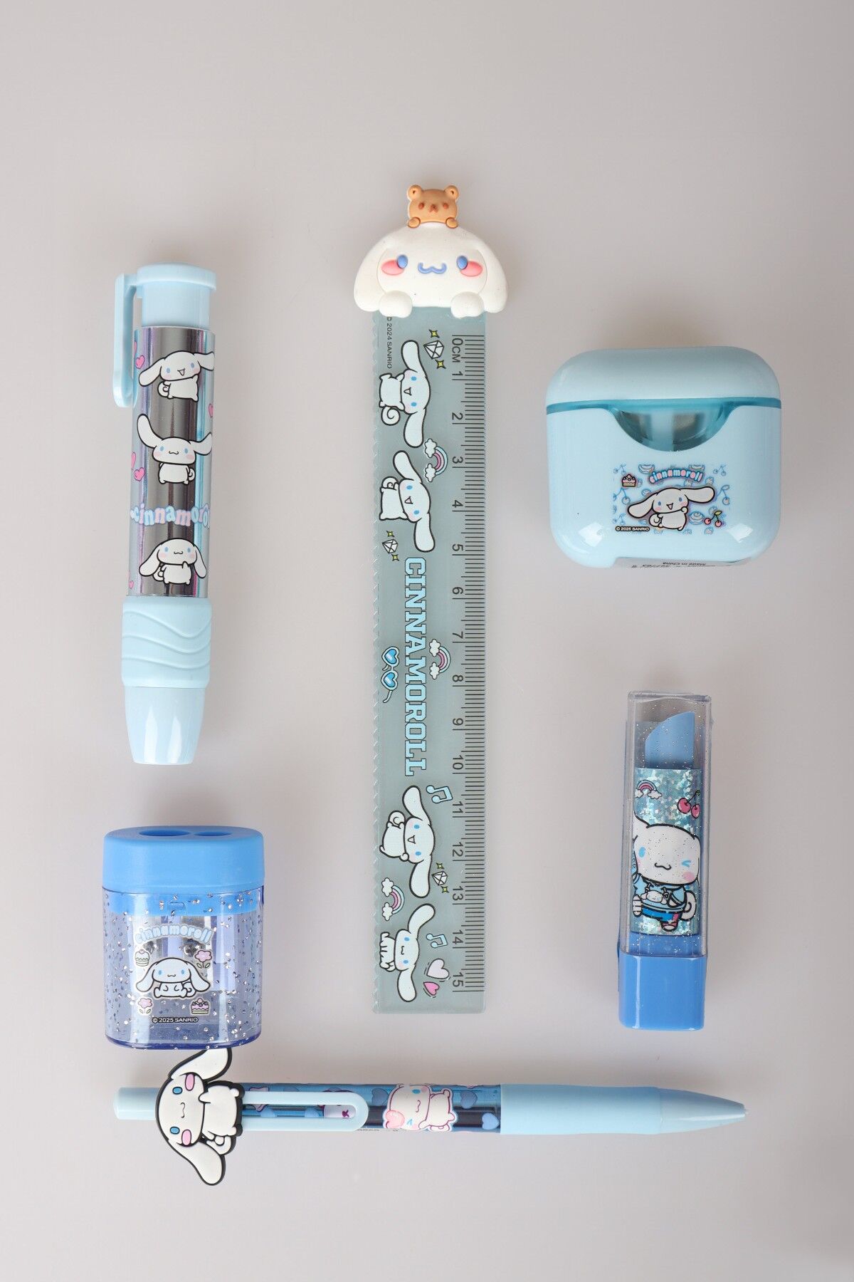 ''DEKOMUS ISLAK MENDİL HEDİYELİ'' LİSANSLI CINNAMOROL 6 PARÇA KIRTASİYE SETİ PODS/KULAKLIK TASARIMLI KALEMTRAŞ,CETVEL,UÇLU KALEM,RUJ SİLGİ