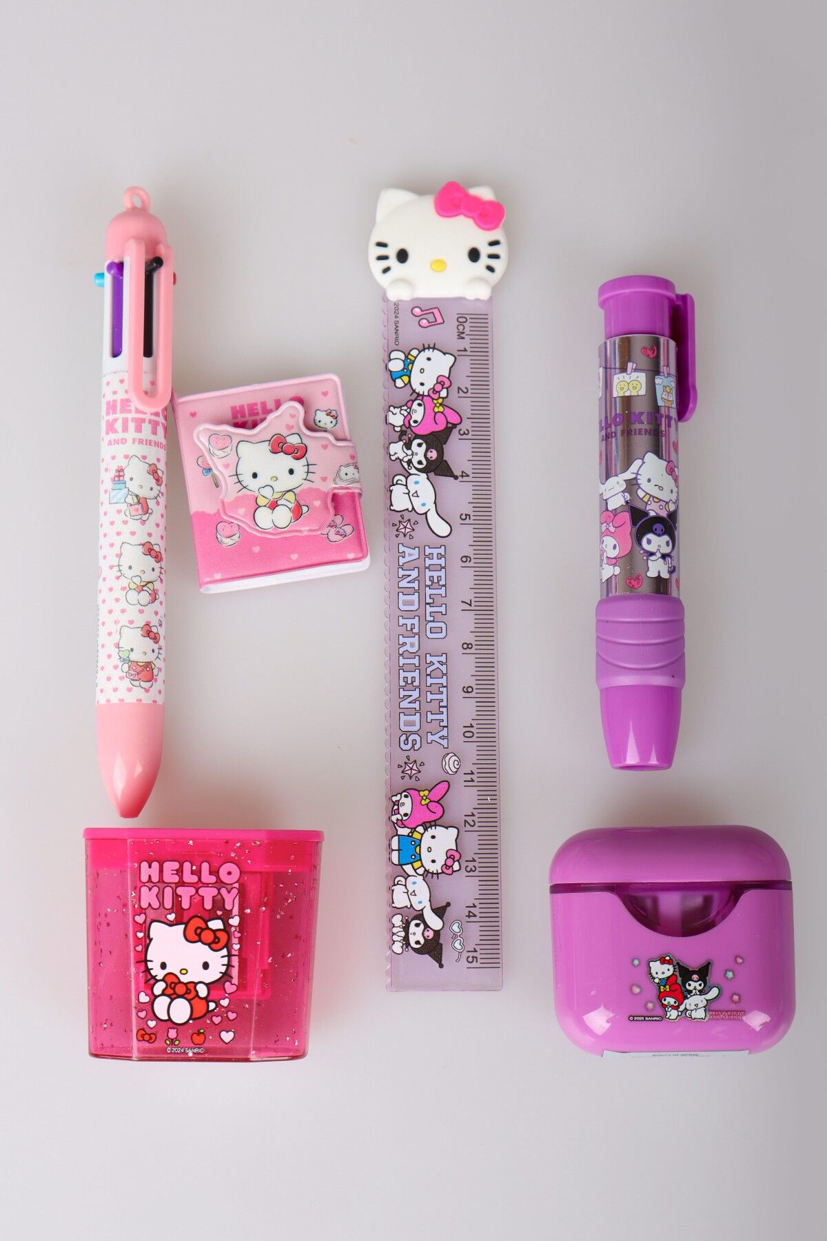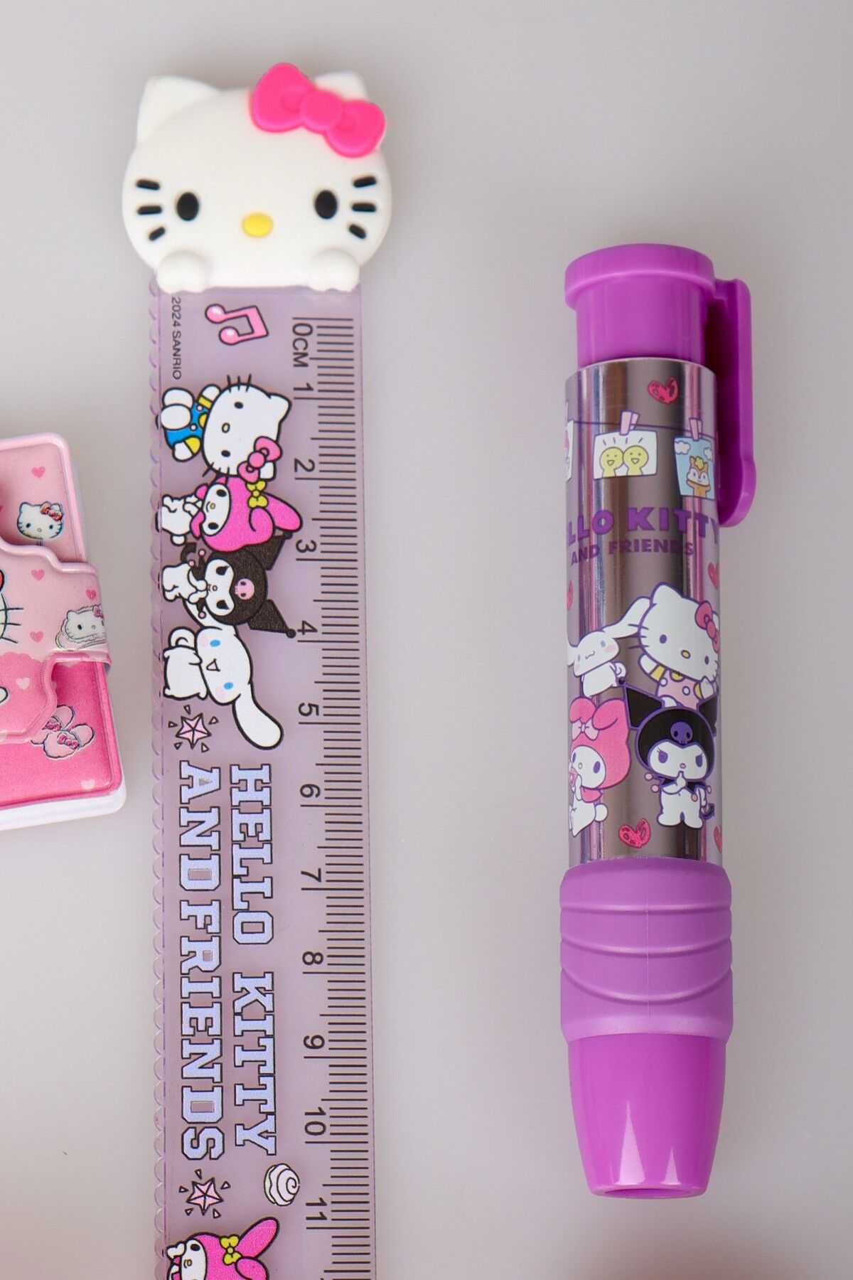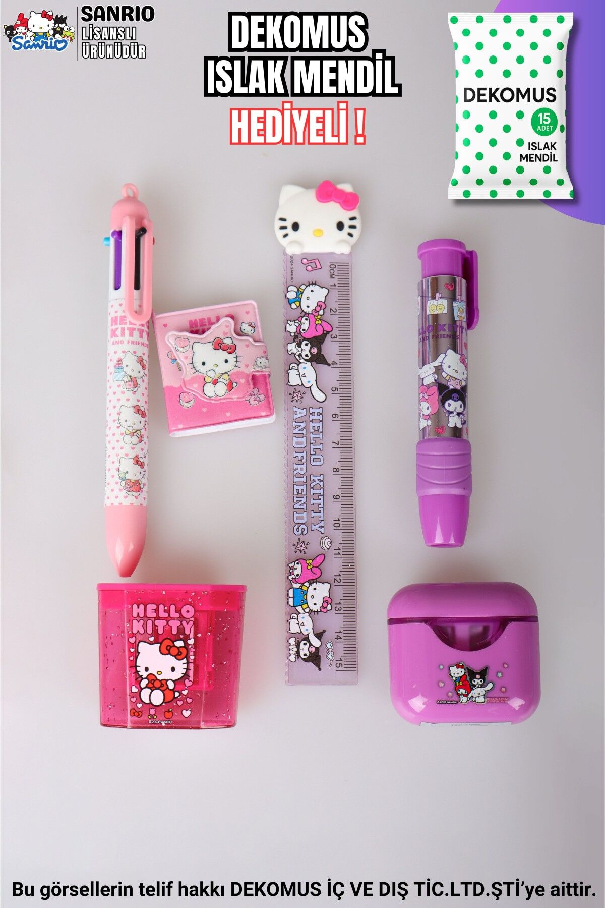 ''DEKOMUS ISLAK MENDİL HEDİYELİ'' LİSANSLI HELLO KITTY & AND FRIENDS 6 PARÇA KIRTASİYE SETİ PODS/KULAKLIK TASARIMLI KALEMTRAŞ,CETVEL,UÇLU KALEM,RUJ SİLGİ