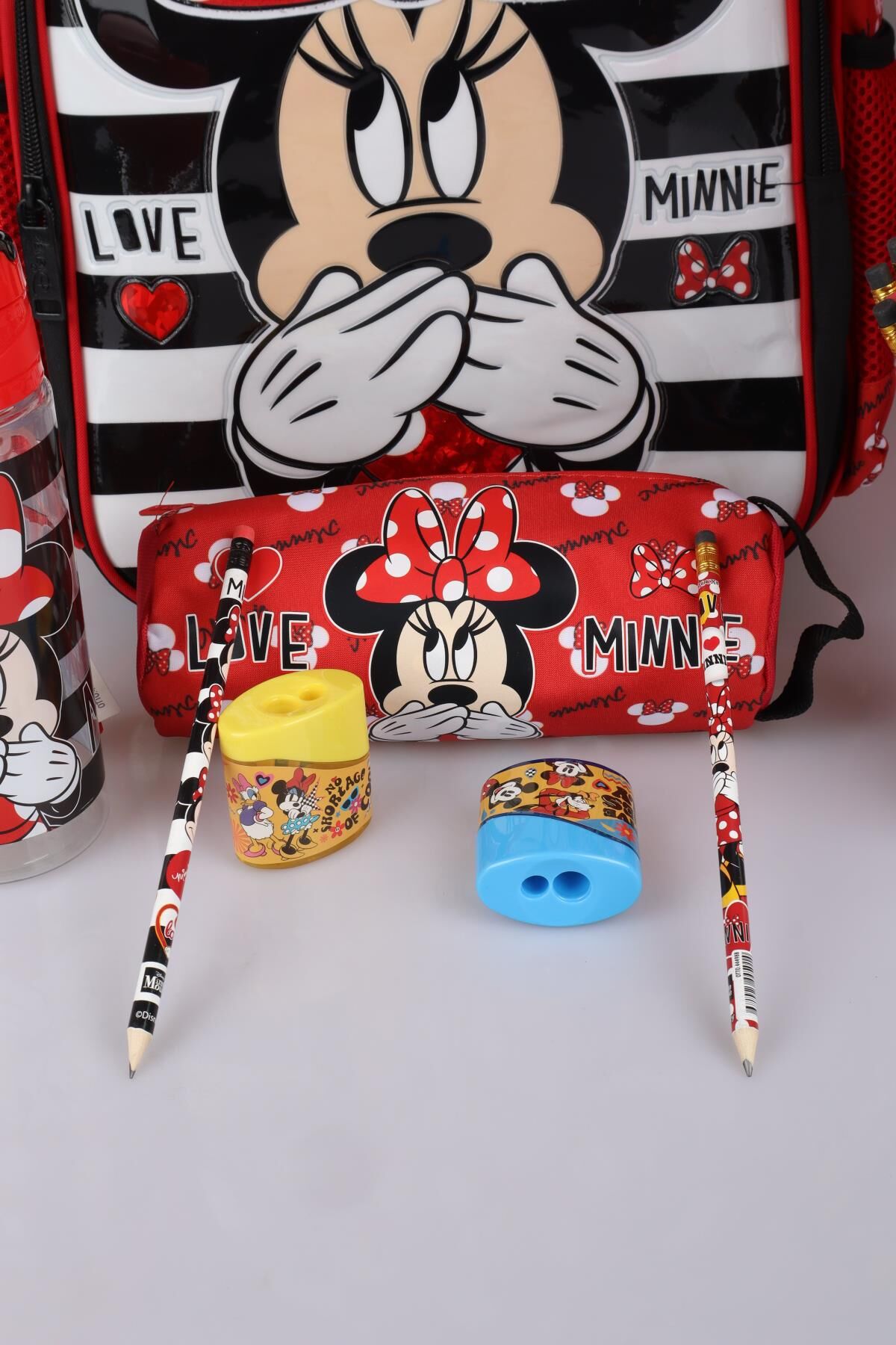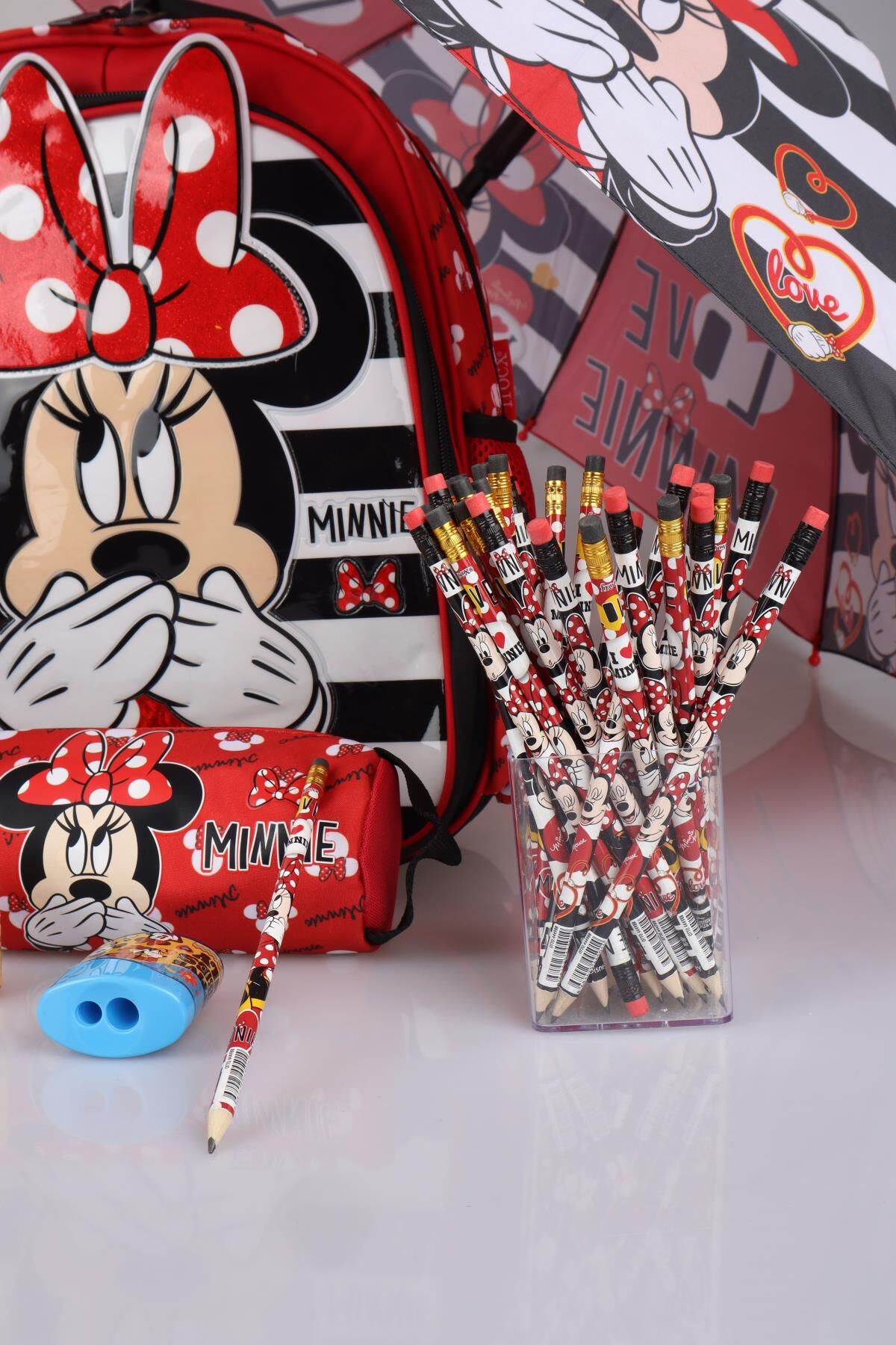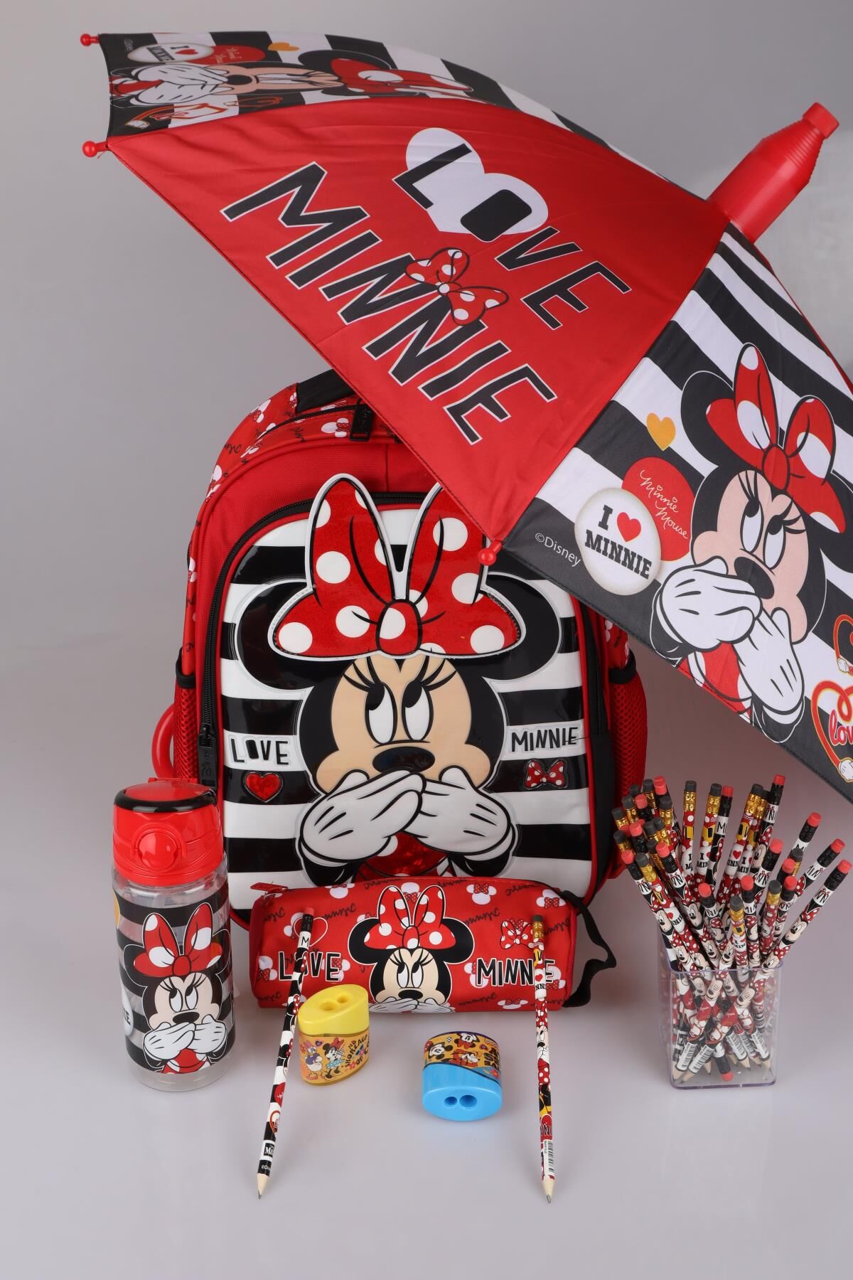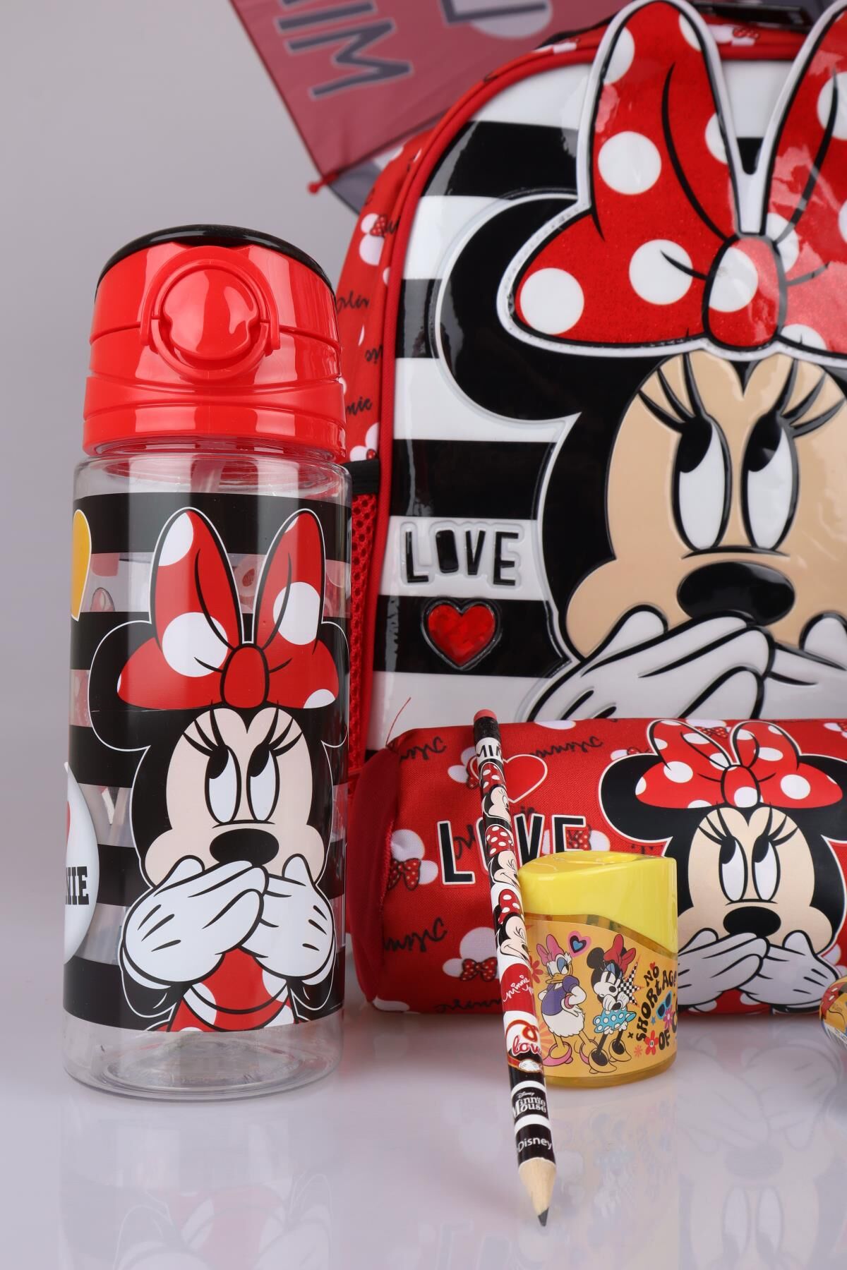 DEKOMUS MINNIE MOUSE seven miniklerimizin yanında! MINNIE MOUSE seven çocuklar için özel olarak hazırlanan bu seti çok seveceksiniz ! MATARA Ürünün kapasitesi 500 ml'dir. Açılır kapanır kapak sayesinde dökülme problemi olmadan rahatlıkla kullanılabilir. . 1 ADET ANAOKUL ÇANTASI ,1 ADET ŞEMSİYE,1 ADET MATARA,1 ADET KALEM ÇANTASI,1 ADET KALEMTRAŞ,2 ADET SİLGİLİ KURŞUN KALEM GÖNDERİLECEKTİR. MINNIE MOUSE olarak sattığımız tüm ürünler orjinal ve lisanslıdır.Sağlığa zararlı kimyasal madde kullanılmamıştır.