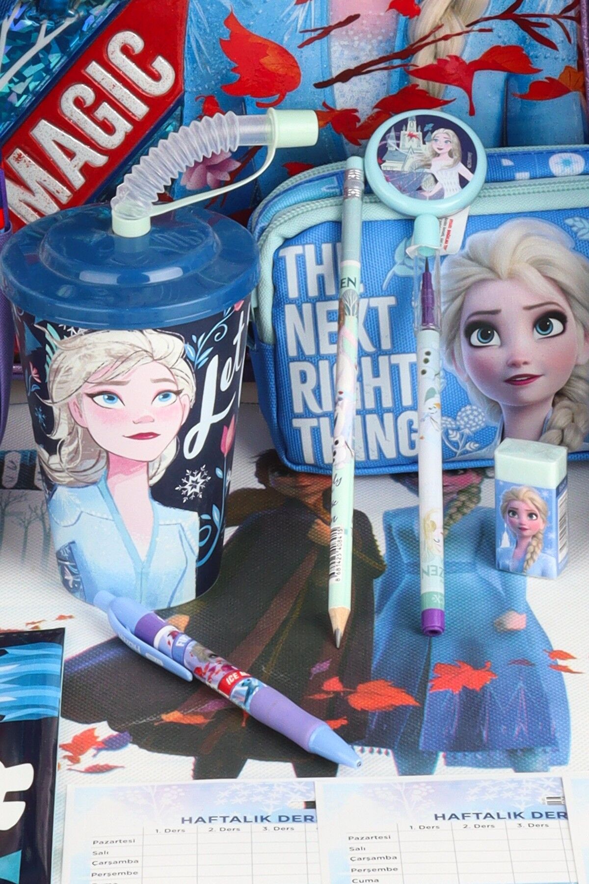 DEKOMUS LİSANSLI ELSA FROZEN KILIFLI ŞEMSİYE İLE OKUL ,BESLENME VE KALEM ÇANTASI,MATARA,BESLENME KABI İLE FULL OKUL/KIRTASİYE SETİ
