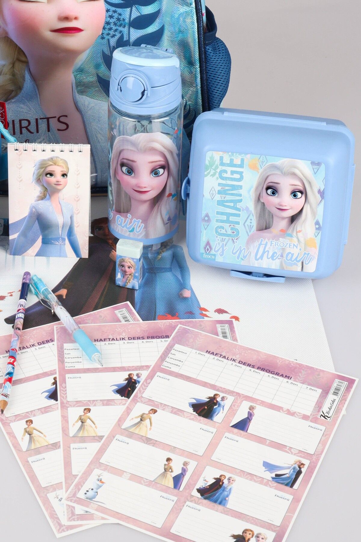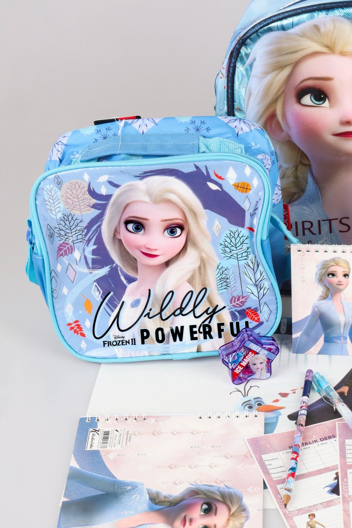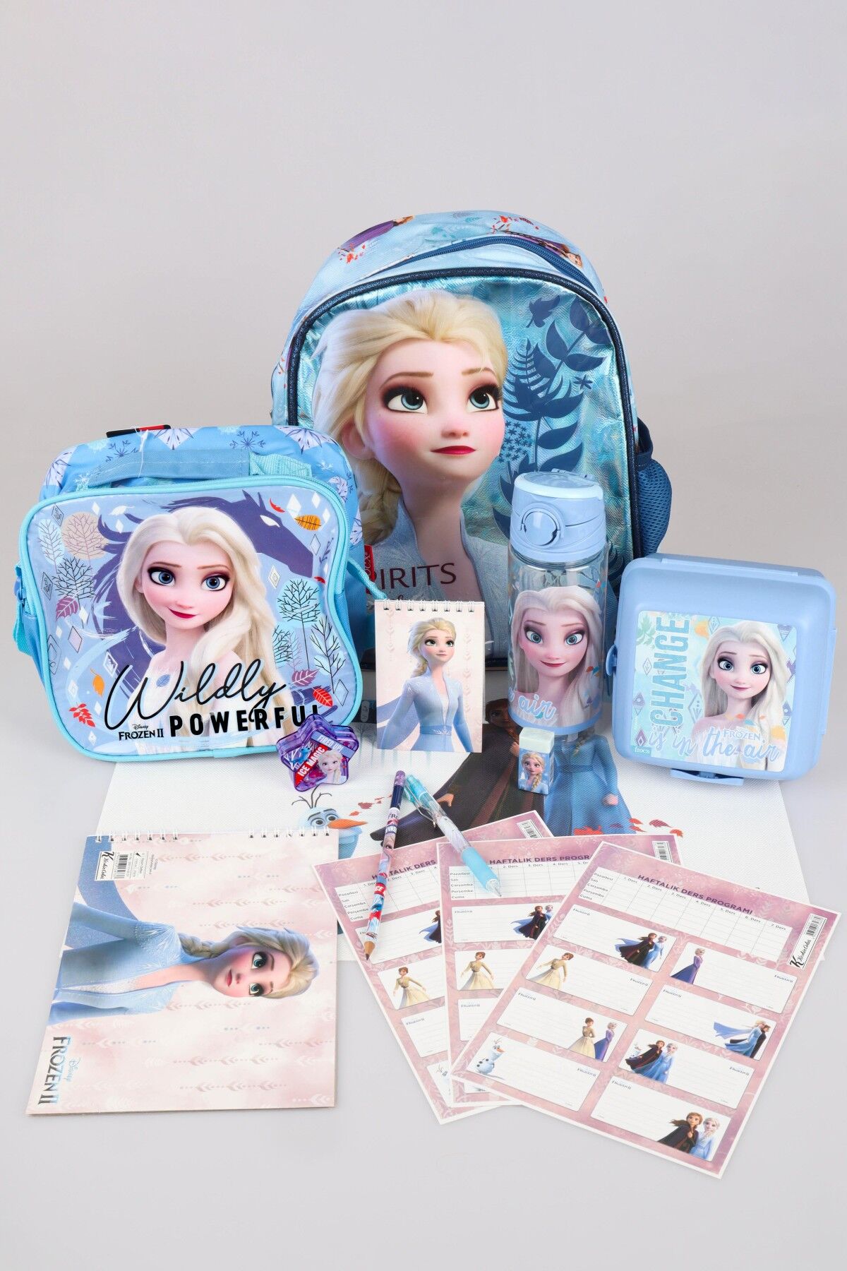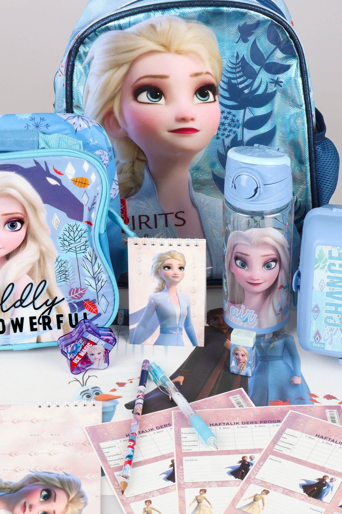 DEKOMUS LİSANSLI ELSA FROZEN TEK BÖLMELİ KÜÇÜK BOY 32 CM ANAOKUL VE BESLENME ÇANTASI,MATARA,BESLENME KABI İLE FULL OKUL/KIRTASİYE SETİ