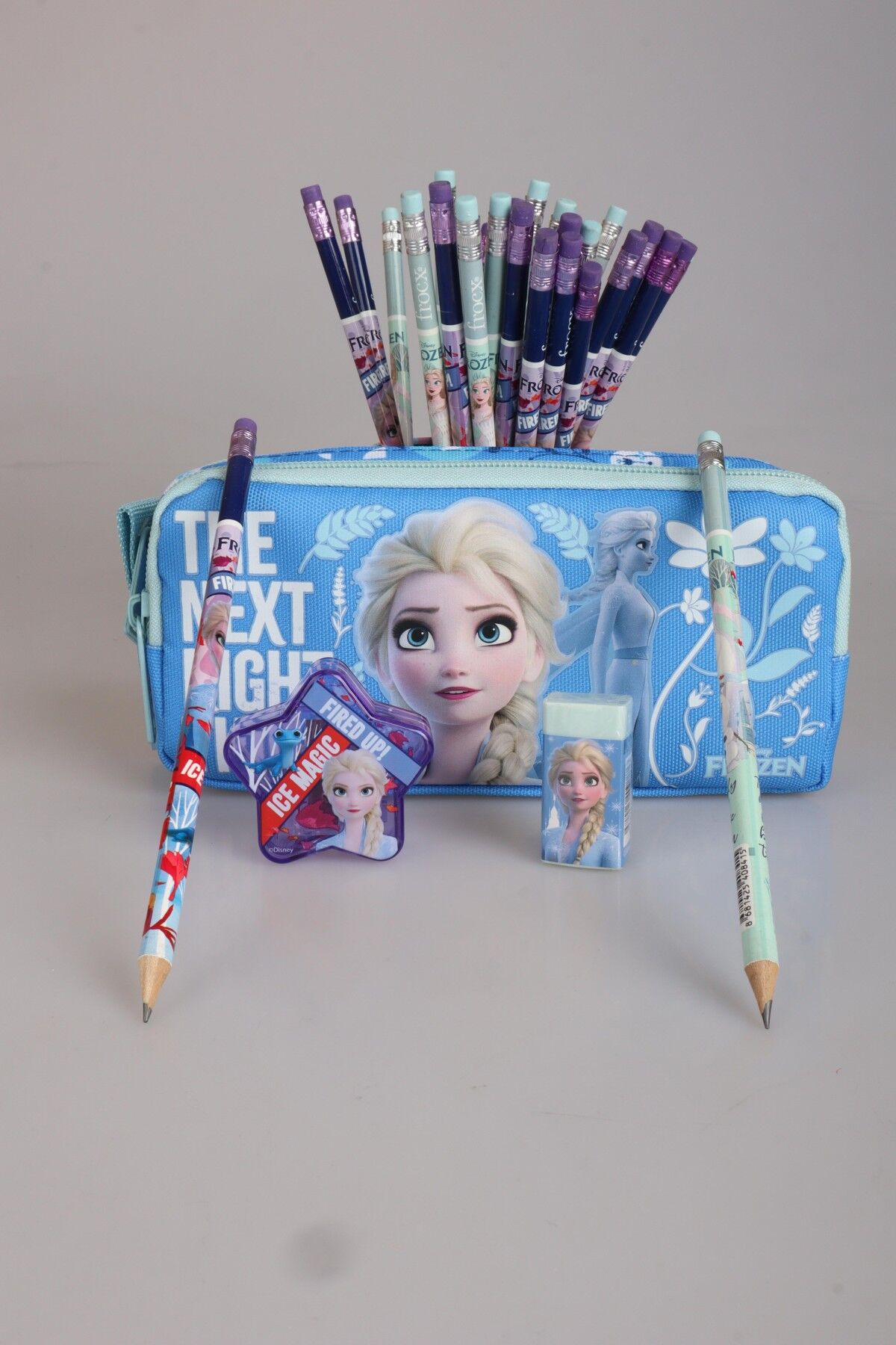 DEKOMUS LİSANSLI FROZEN ELSA KALEM ÇANTASI,2 ADET SİLGİLİ KURŞUN KALEM , YILDIZ KALEMTRAŞ VE SİLGİ KIRTASİYE OKUL SETİ