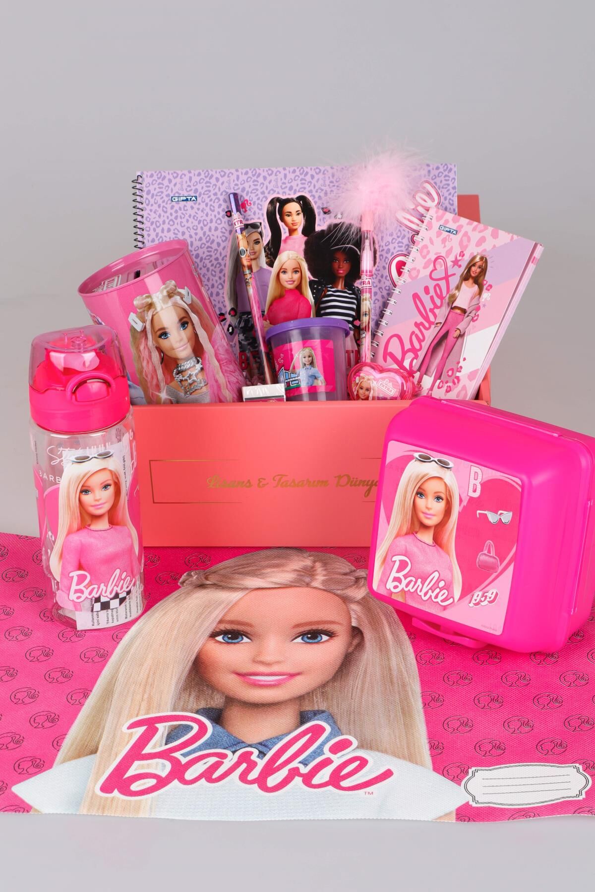 DEKOMUS ÖZEL KUTULU LİSANSLI BARBIE MATARA,BESLENME ÖRTÜSÜ,BESLENME KABI,TÜYLÜ GEÇMELİ KURŞUN KALEM,SİLGİ,KALEMTRAŞ,KUMBARA ''FULL'' HOBİ KIRTASİYE SETİ