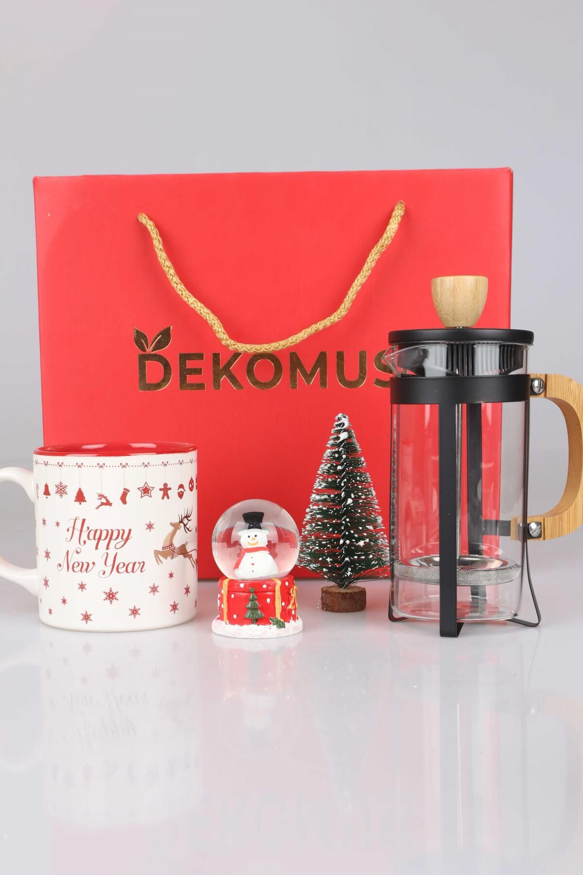 DEKOMUS ÖZEL KUTULU MUTLU YILLAR SERİSİ FRENCHPRESS, KUPA, ÇAM AĞACI VE KAR KÜRESİ SETİ ''YENİ YIL MERRY CHRISTMAS ''