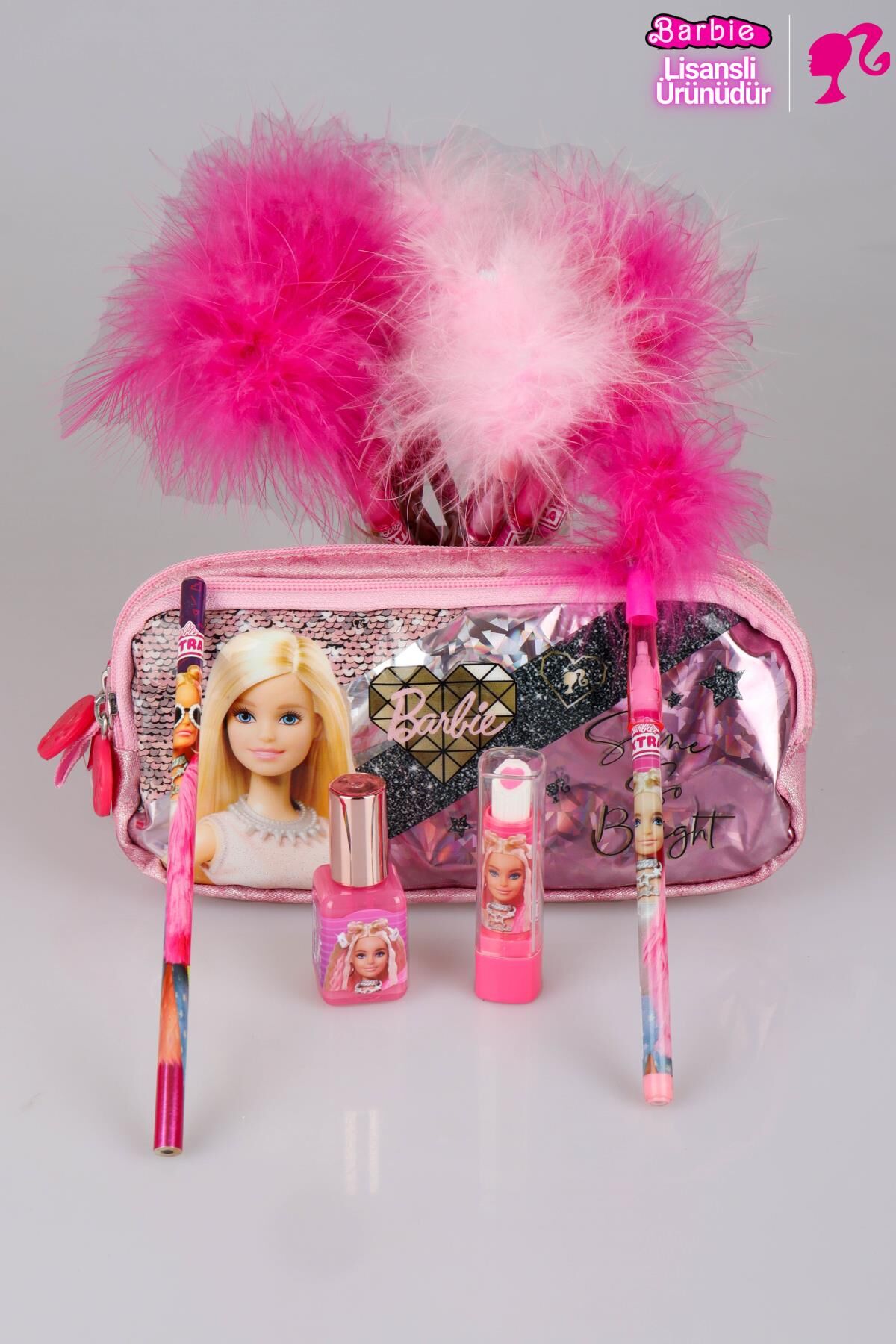 LİSANSLI BARBIE GİZEMLİ PARILTILAR KOLEKSİYONU KALEM ÇANTASI,KURŞUN KALEM,SİLGİLİ KALEMTRAŞ,RUJ SİLGİ VE TÜYLÜ GEÇMELİ KURŞUN KALEM KIRTASİYE SETİ
