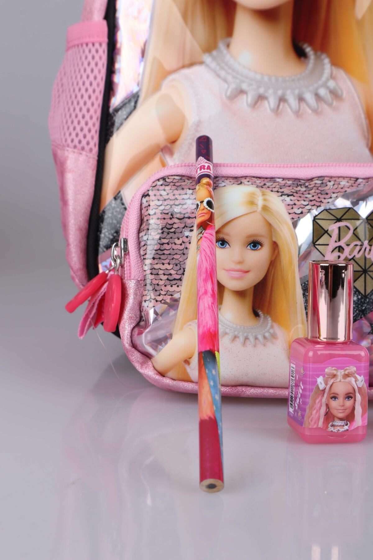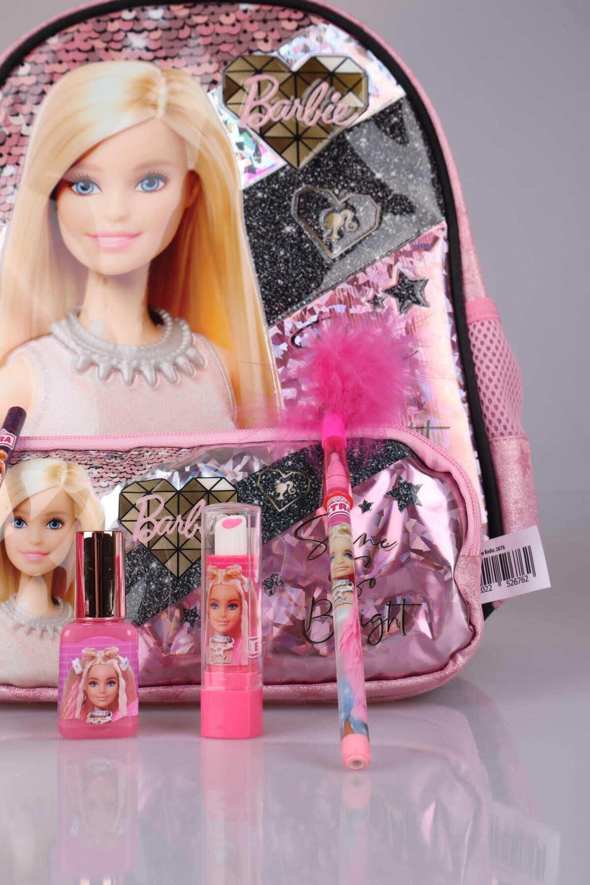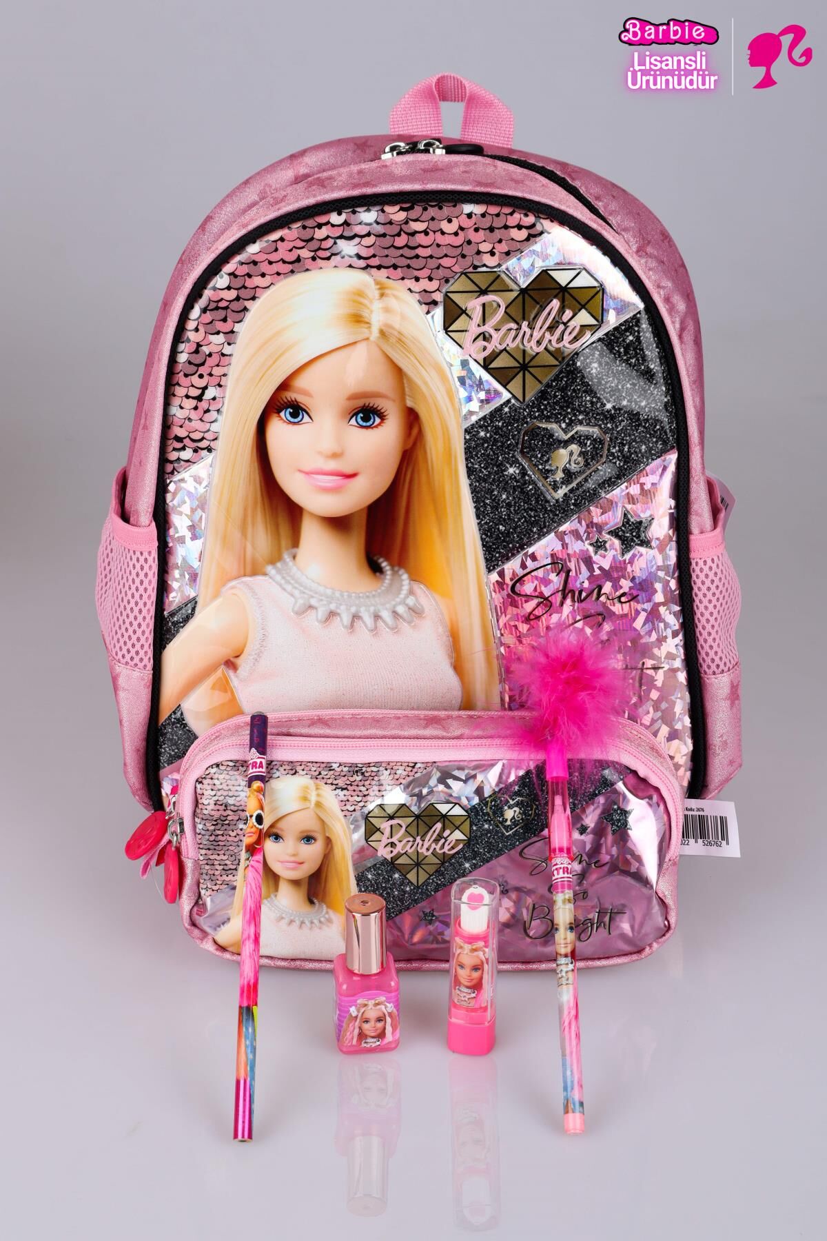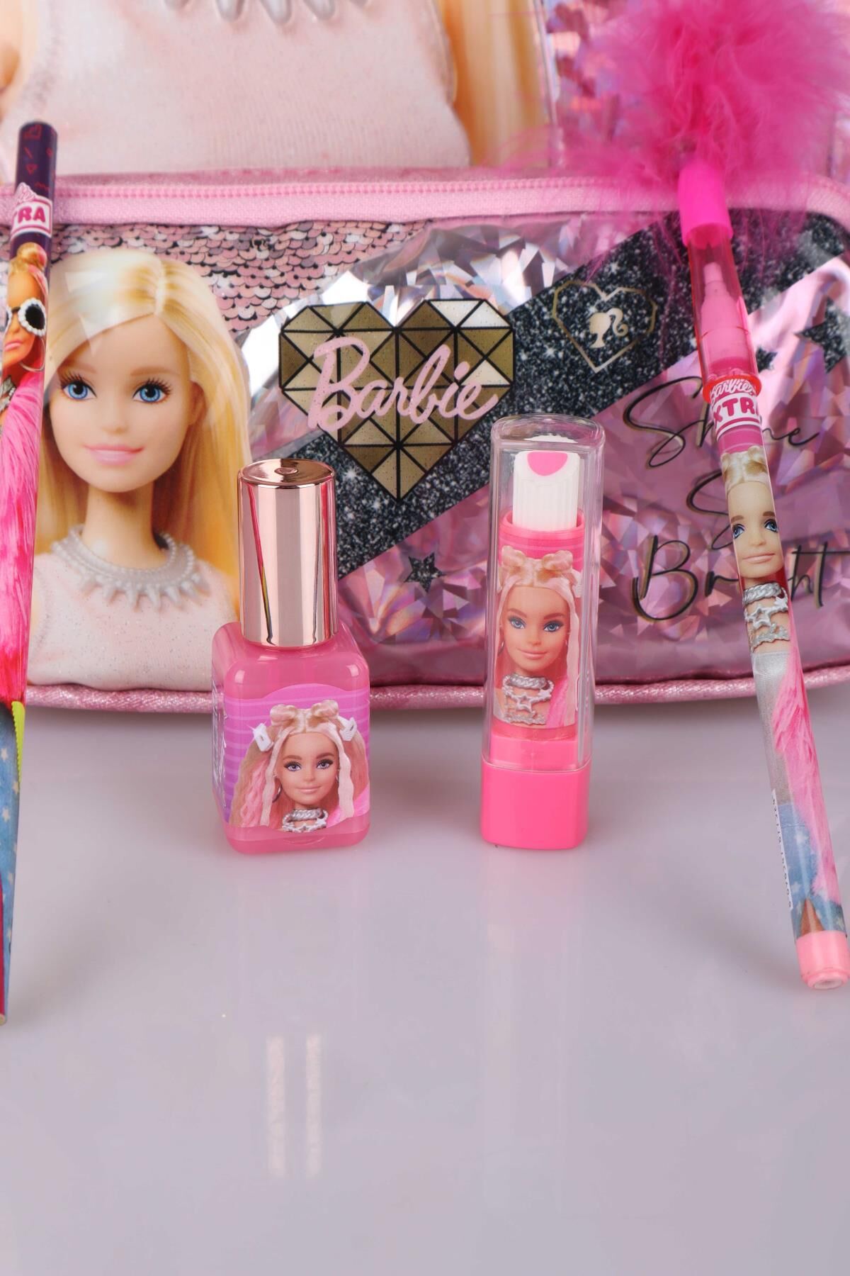 Set İçeriği:1 adet anaokul çantası,1 adet KALEM ÇANTASI,1 adet oje tasarım silgili kalemtraş , 1 adet tüylü geçmeli kalem,1 ADET kurşun kalem,1 adet ruj silgi ****BARBIE olarak sattığımız tüm ürünler orjinal, lisanslıdır.Sağlığa zararlı kimyasal madde kullanılmamıştır.