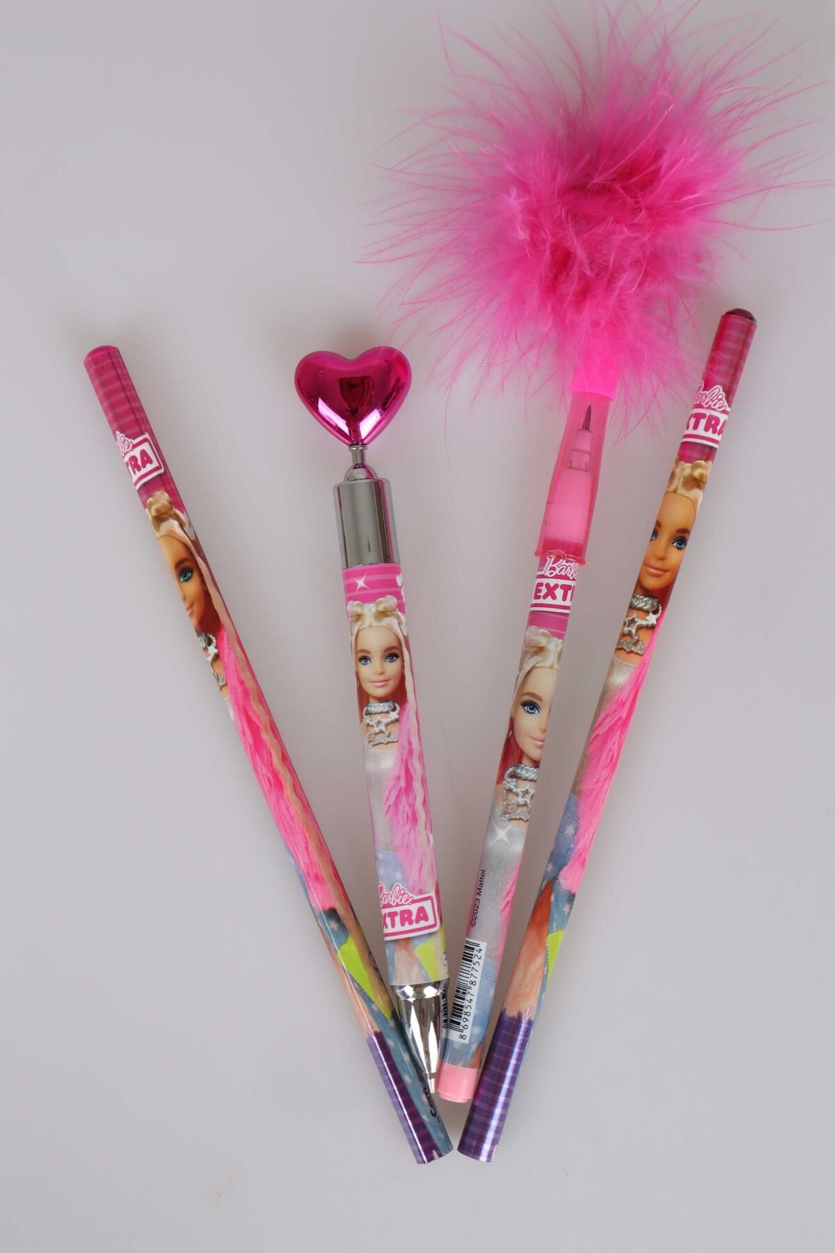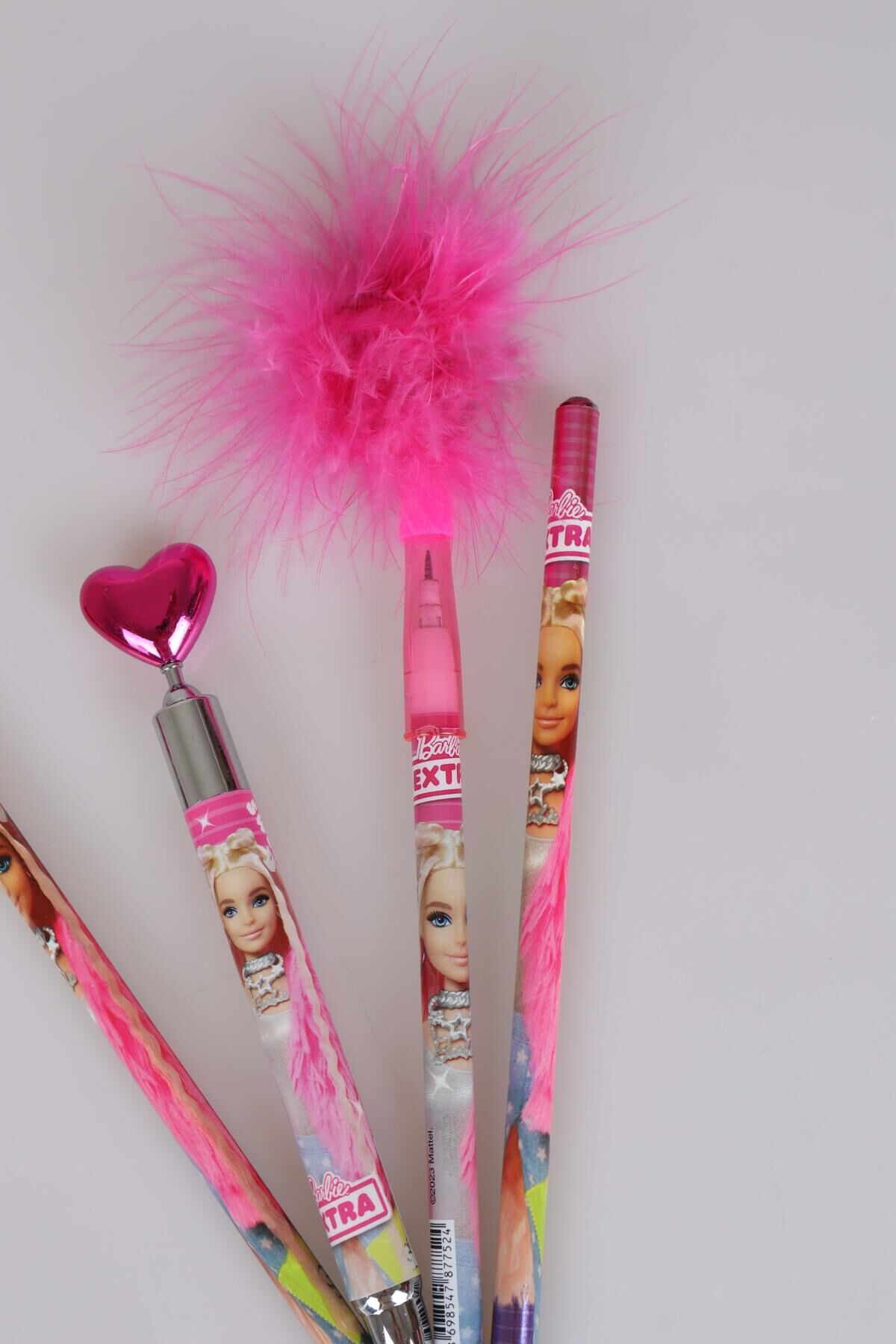 LİSANSLI BARBIE TÜYLÜ GEÇMELİ KALEM,KALP BAŞLIKLI VERSATİL KURŞUN KALEM, 2 ADET KURŞUN KALEM KIRTASİYE SETİ