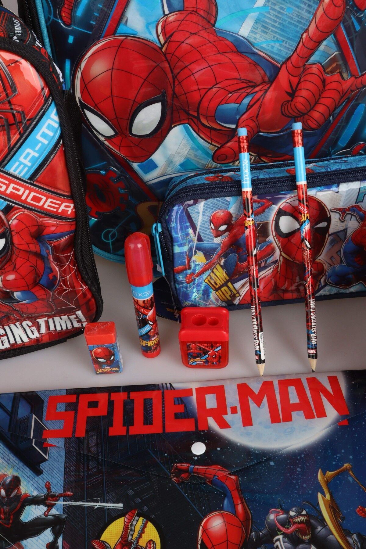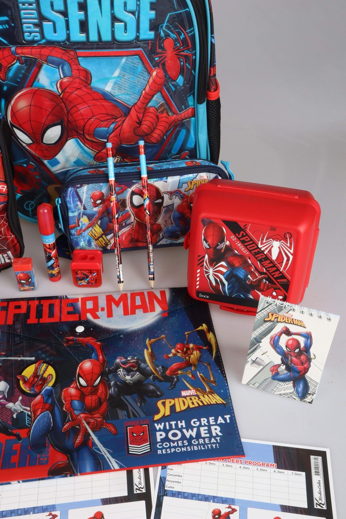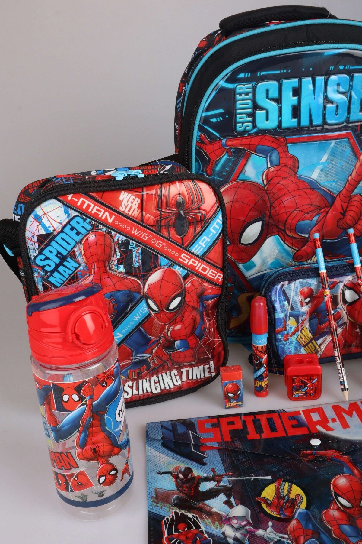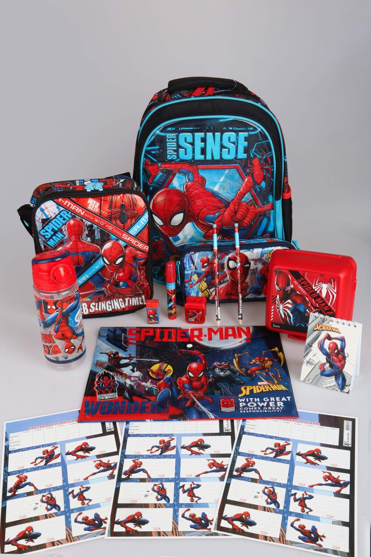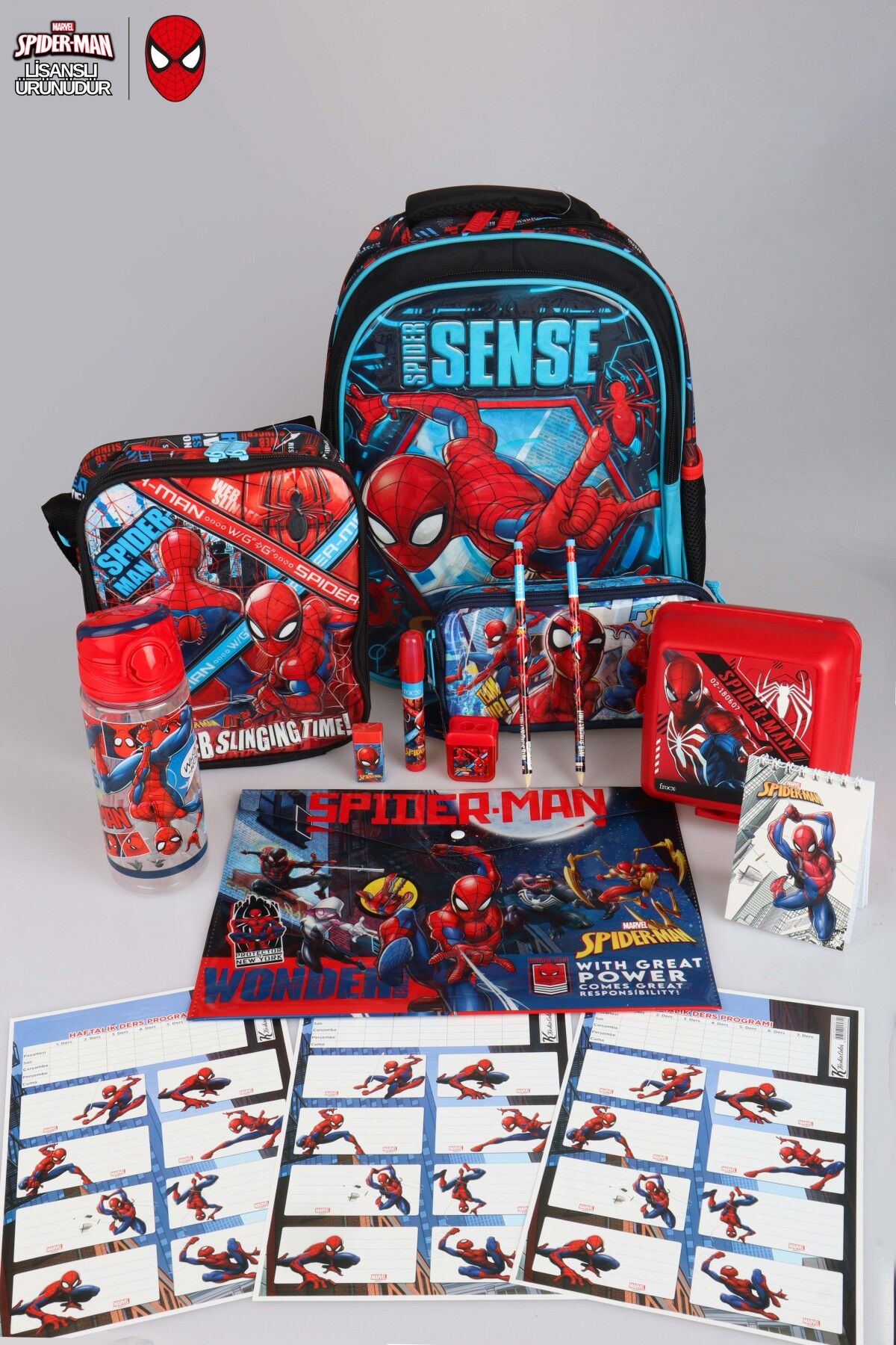 DEKOMUS İLE YENİ SEZON LİSANSLI SPIDERMAN OKUL,BESLENME VE KALEM ÇANTASI,MATARA,BESLENME KABI İLE FULL KIRTASİYE SETİ