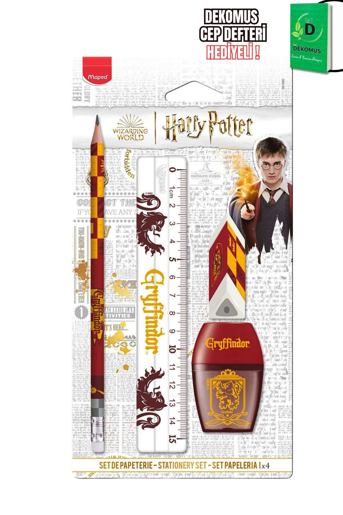 Maped x Dekomus Lisanslı Harry Potter Gryffindor Wizard 4'lü Kırtasiye Seti Kurşun Kalem, Cetvel, Silgi Ve Kalemtraş, ''Dekomus Cep Defteri Hediyeli''