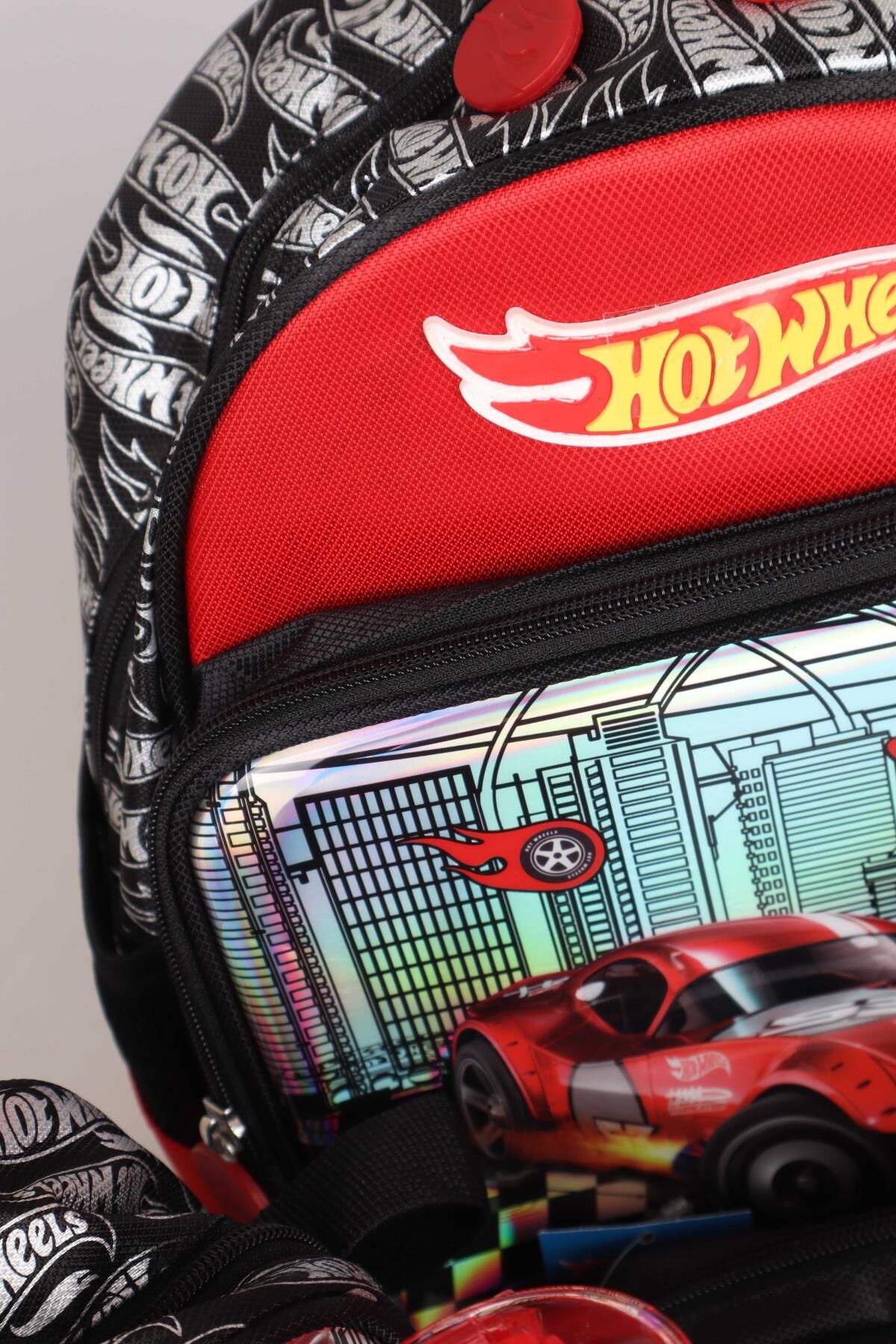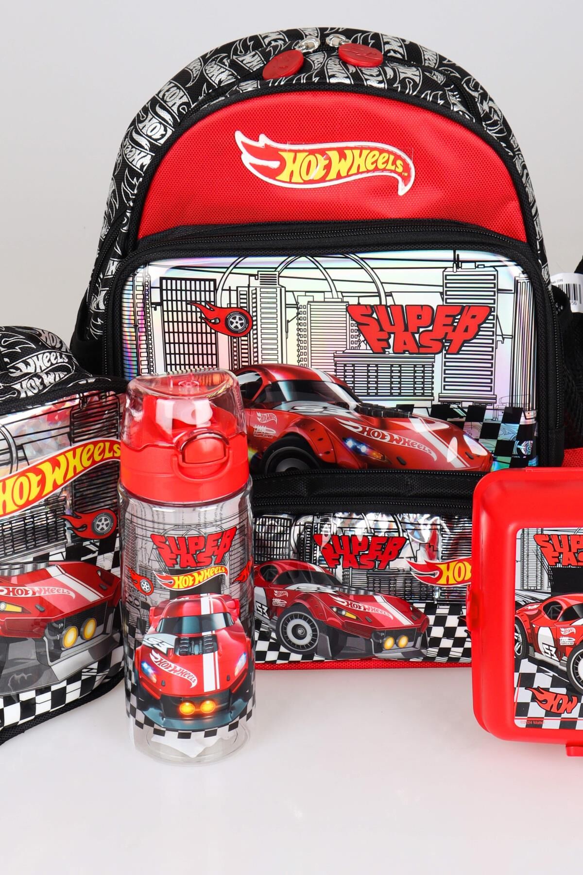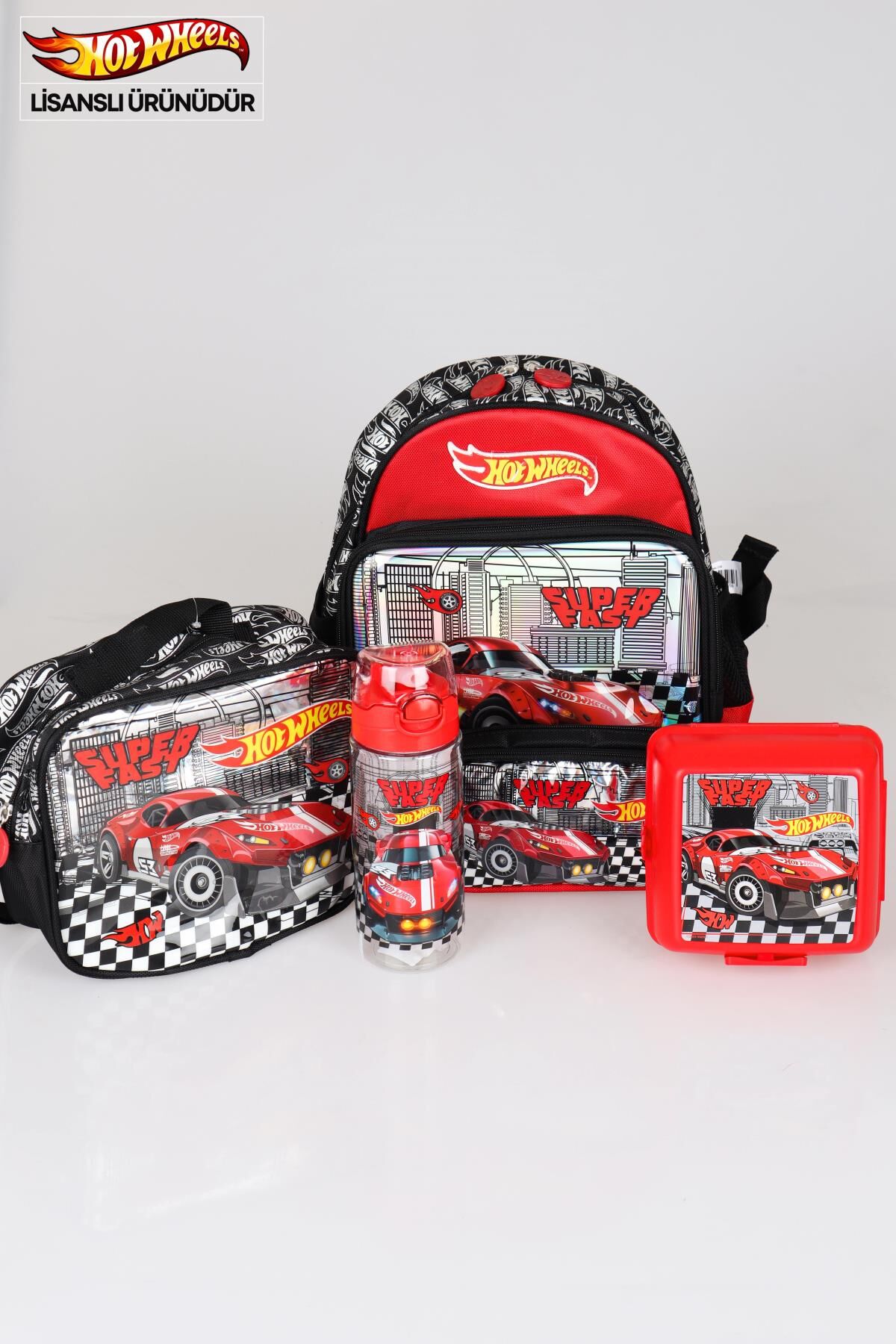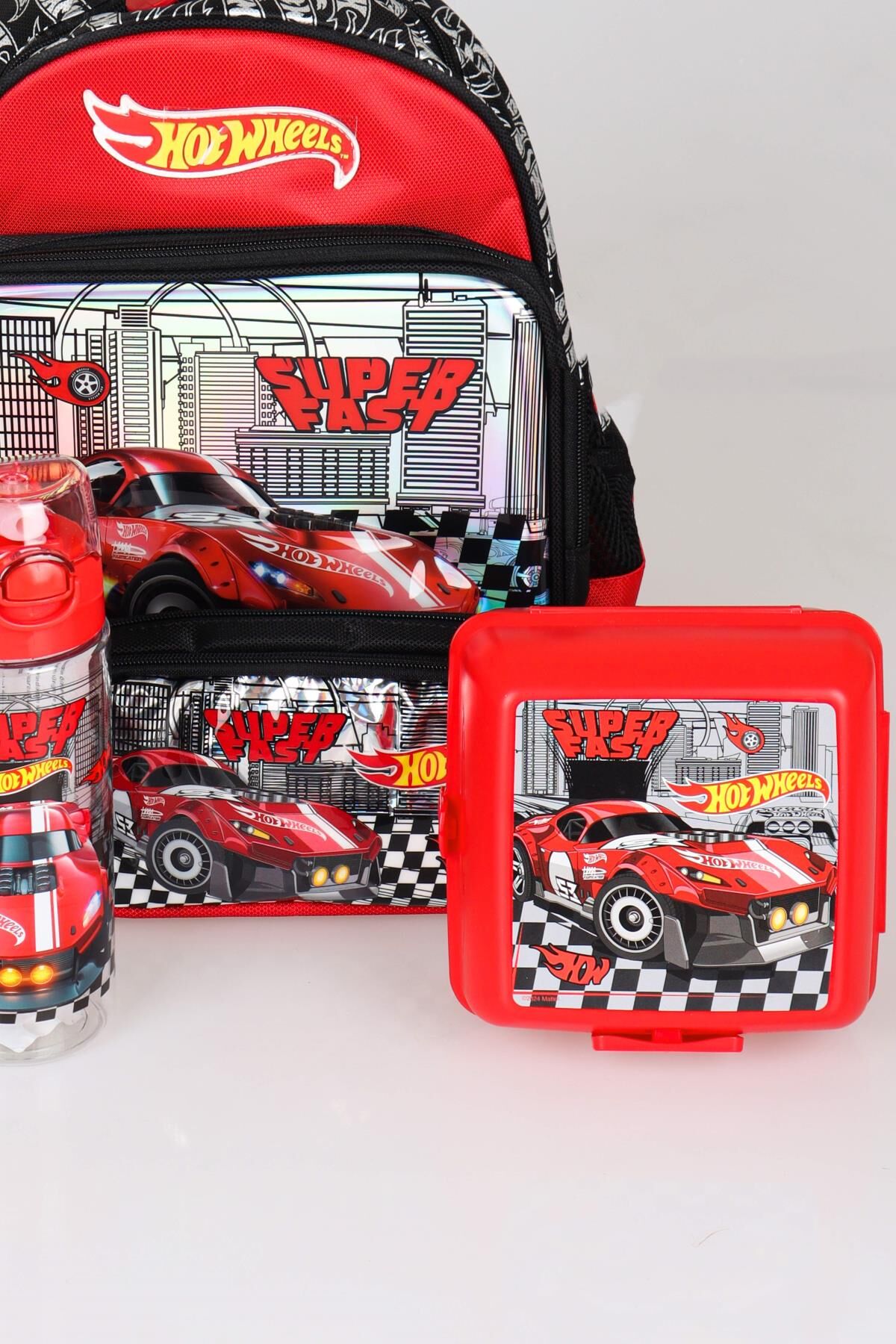 TEK BÖLMELİ KÜÇÜK BOY 32 CM HOT WHEELS ANAOKUL,KALEM VE BESLENME ÇANTASI, 2 KATLI BESLENME KABI İLE 500 ML MATARA SETİ