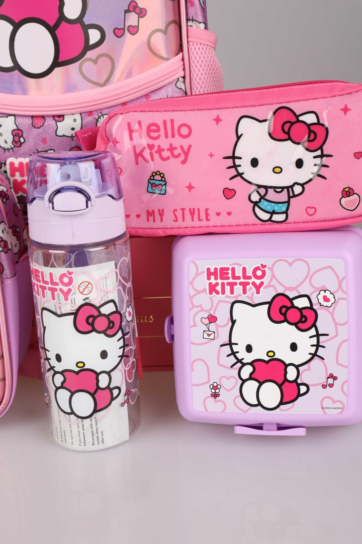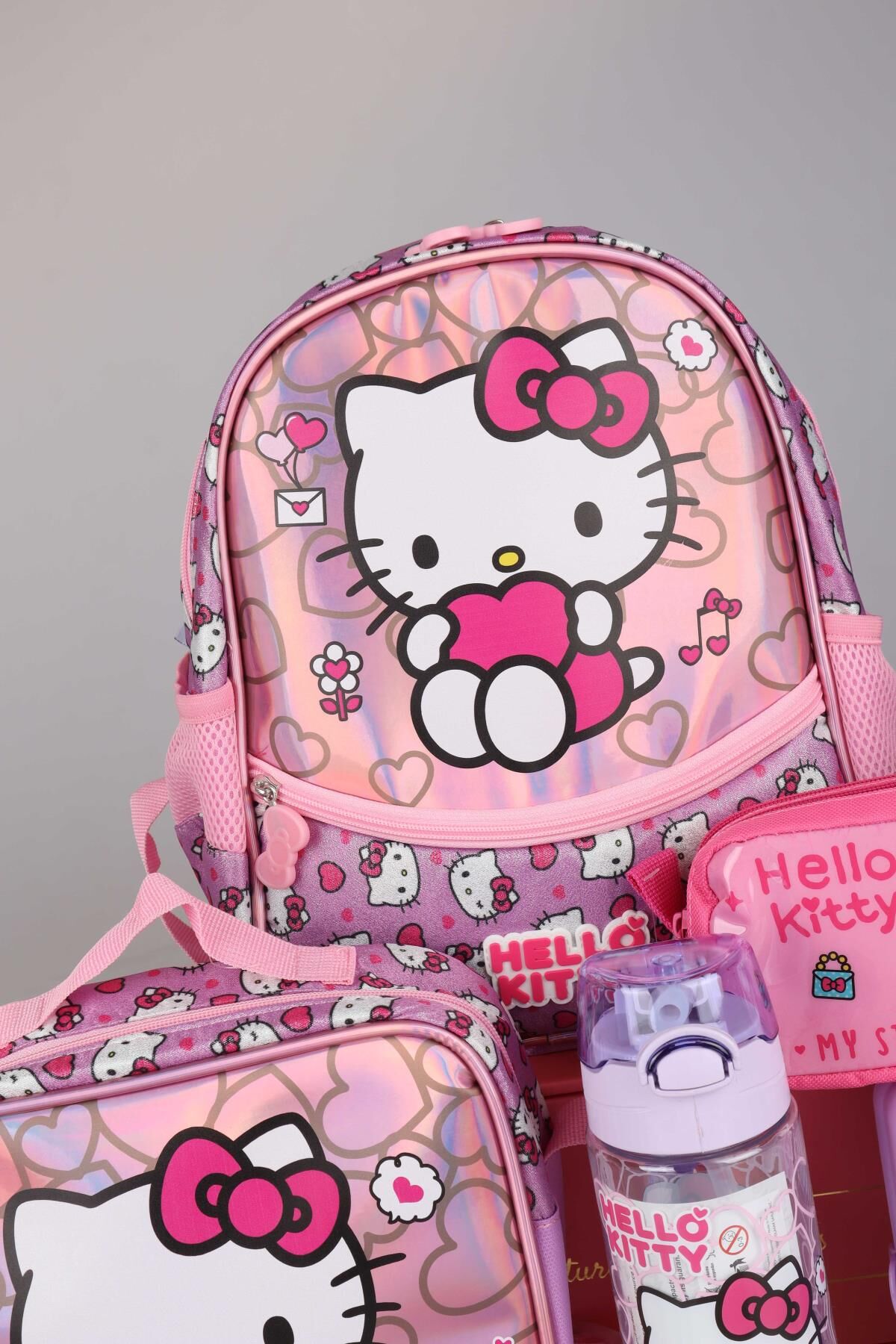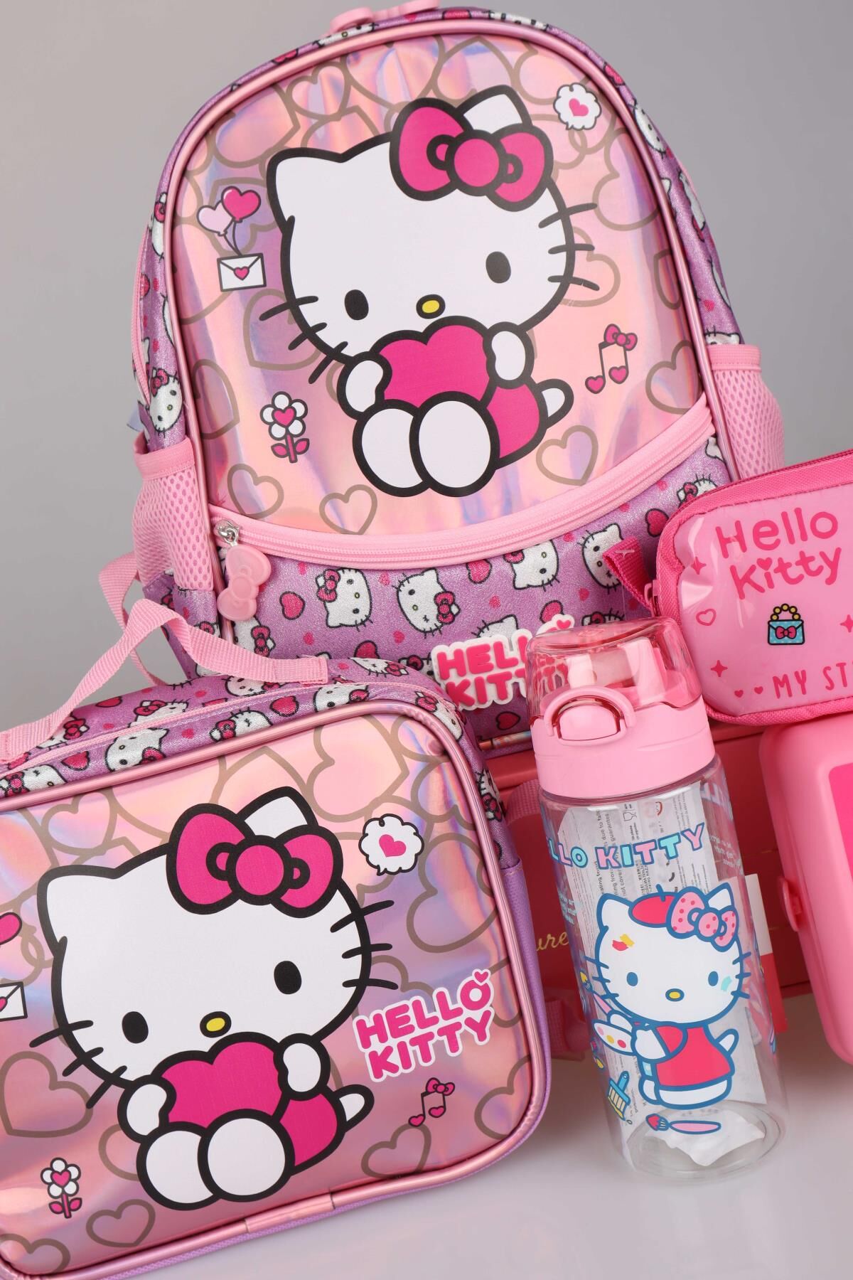 DEKOMUS HELLO KITTY seven miniklerimizin yanında! Sizler için özel olarak hazırlanan bu seti çok seveceksiniz :) Sağlığa zararlı kimyasal madde kullanılmamıştır. HELLO KITTY olarak sattığımız tüm ürünler orjinal ve lisanslıdır. 1 adet anaokul çantası ,1 adet beslenme kabı ,1 adet beslenme çantası,1 adet 500 ml matara,1 adet kalem çantası gönderilecektir.NOT:BESLENME KABI VE MATARA RENKLERİ KARIŞIK GÖNDERİLECEKTİR.