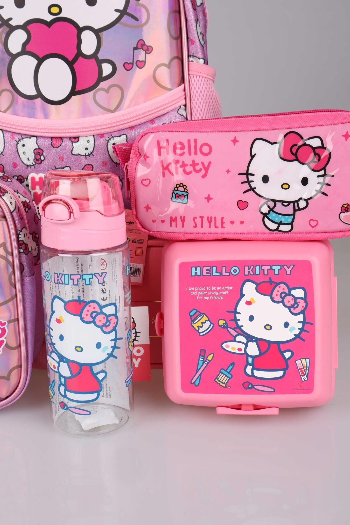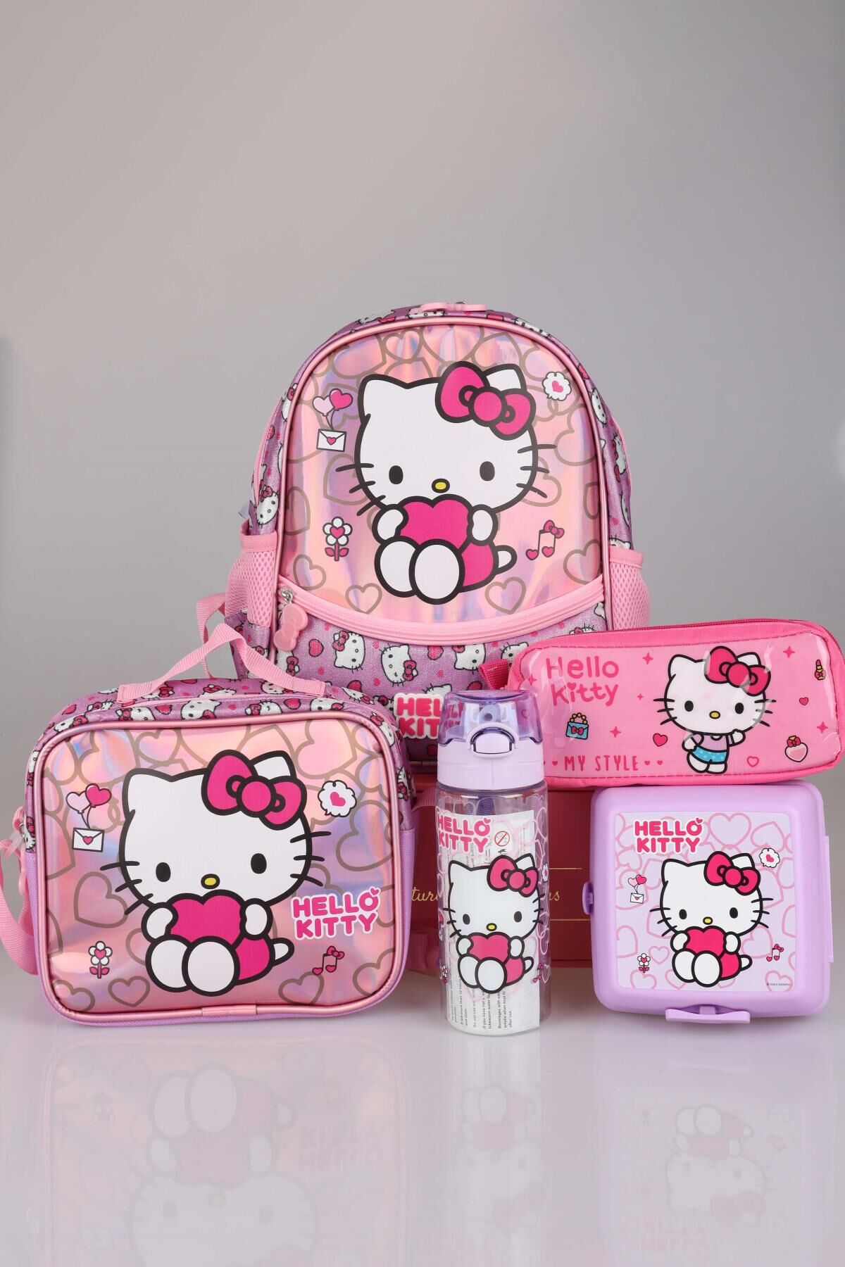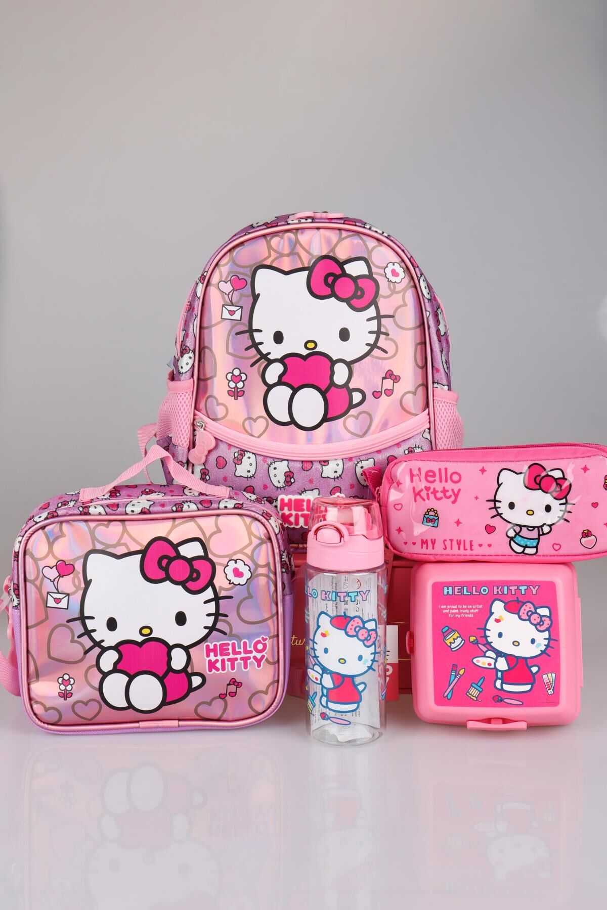 DEKOMUS HELLO KITTY seven miniklerimizin yanında! Sizler için özel olarak hazırlanan bu seti çok seveceksiniz :) Sağlığa zararlı kimyasal madde kullanılmamıştır. HELLO KITTY olarak sattığımız tüm ürünler orjinal ve lisanslıdır. 1 adet anaokul çantası ,1 adet beslenme kabı ,1 adet beslenme çantası,1 adet 500 ml matara,1 adet kalem çantası gönderilecektir.NOT:BESLENME KABI VE MATARA RENKLERİ KARIŞIK GÖNDERİLECEKTİR.