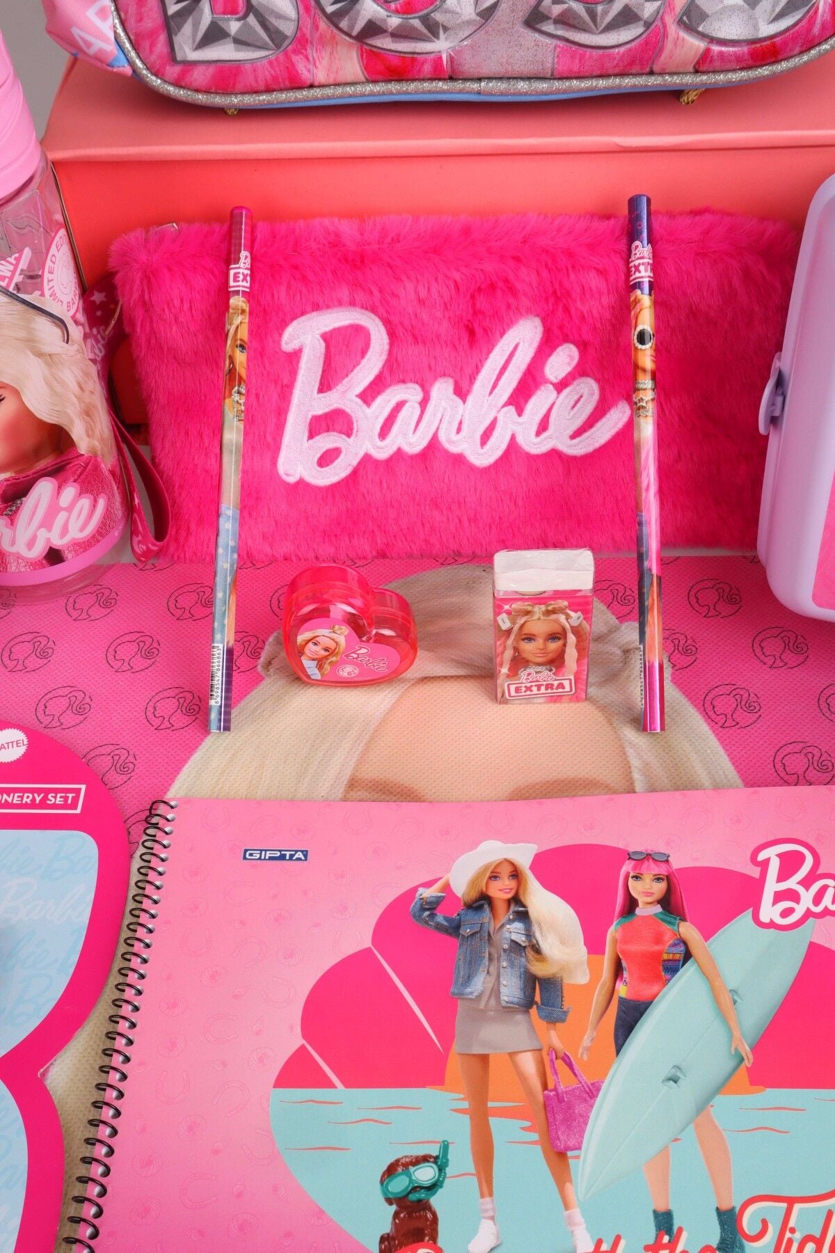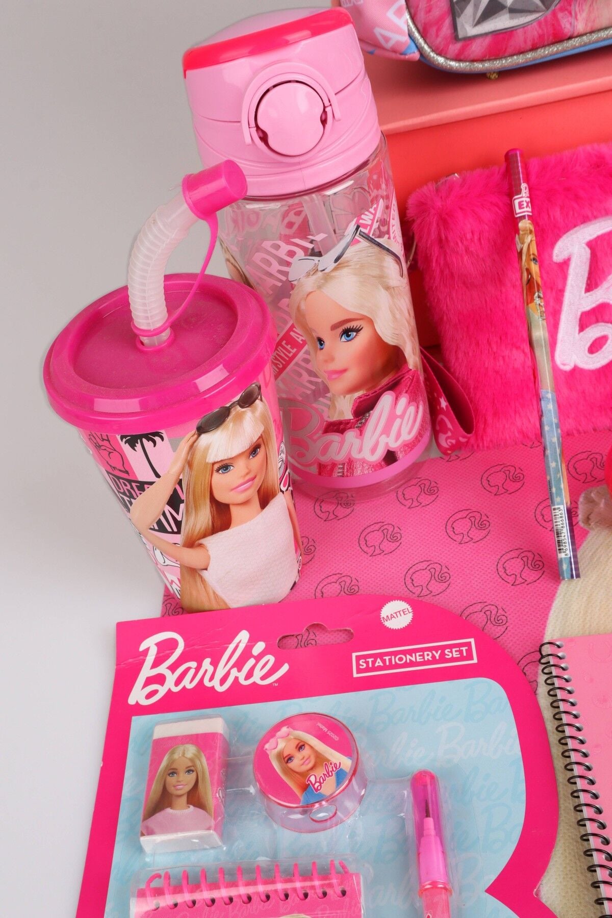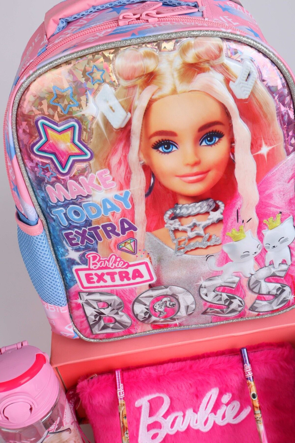 x Dekomus Lisanslı Barbie ''Extra Glam Collection'' 35 Cm Anaokul Ve Tüylü Kalem Çantası İle 500 Ml Matara, Beslenme Kabı Full Kırtasiye Seti