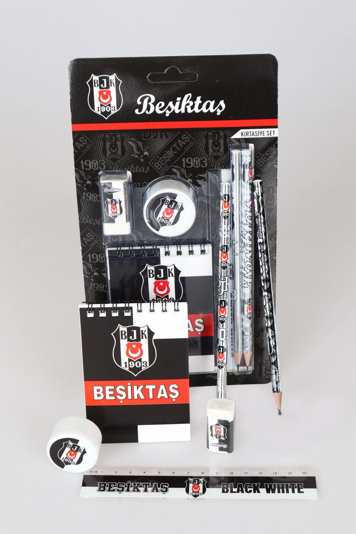 ''DEKOMUS CEP DEFTERİ HEDİYELİ'' YENİ SEZON LİSANSLI BEŞİKTAŞ 6'LI KIRTASİYE SETİ NOT DEFTERİ,CETVEL,SİLGİ,KALEMTRAŞ,2 ADET KURŞUN KALEM