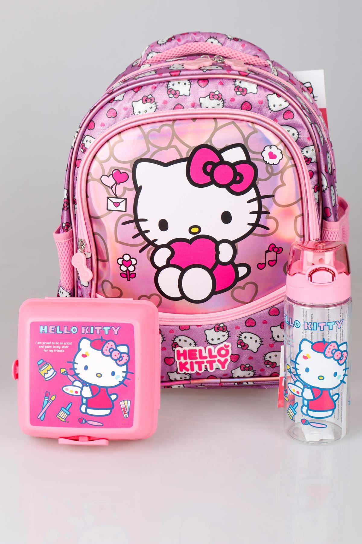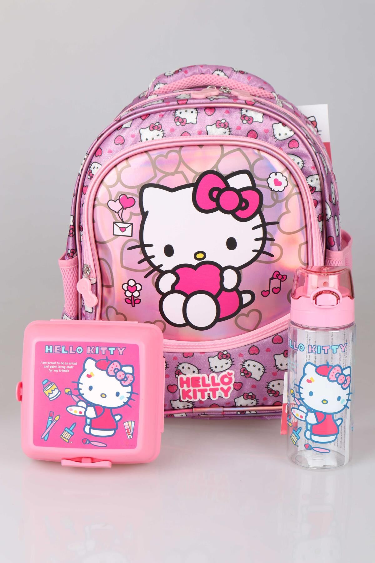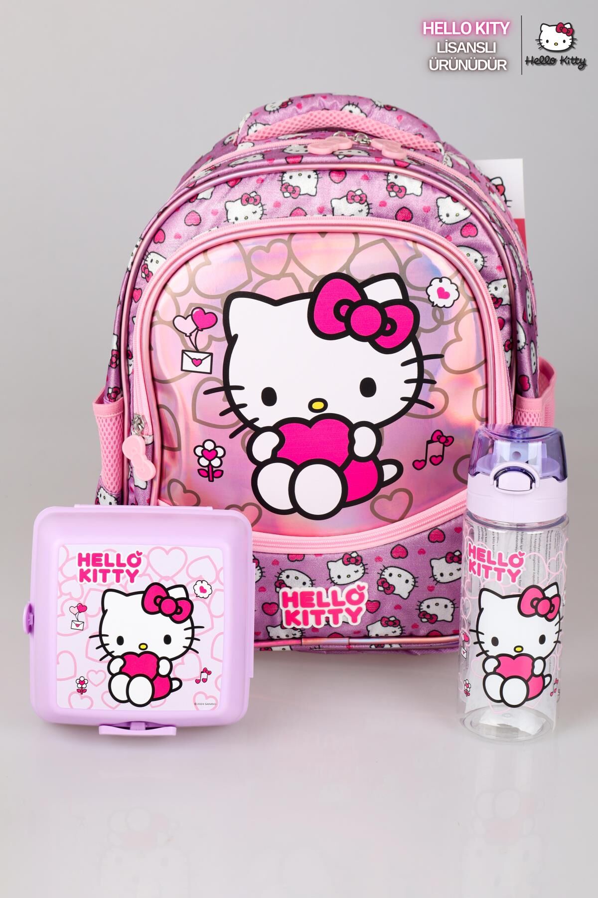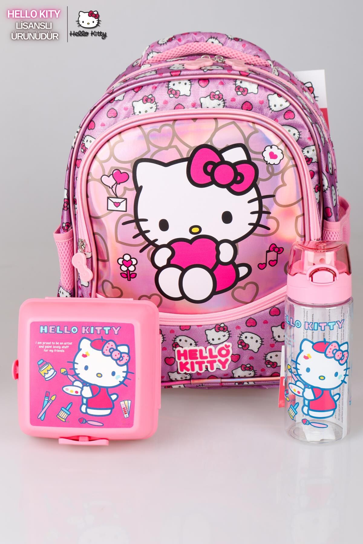 YENİ SEZON LİSANSLI HELLO KITTY'NIN PIRILTILI DÜNYASI ÖZEL KOLEKSİYON OKUL ÇANTASI ,BESLENME KABI VE TRITAN MATARA SETİ