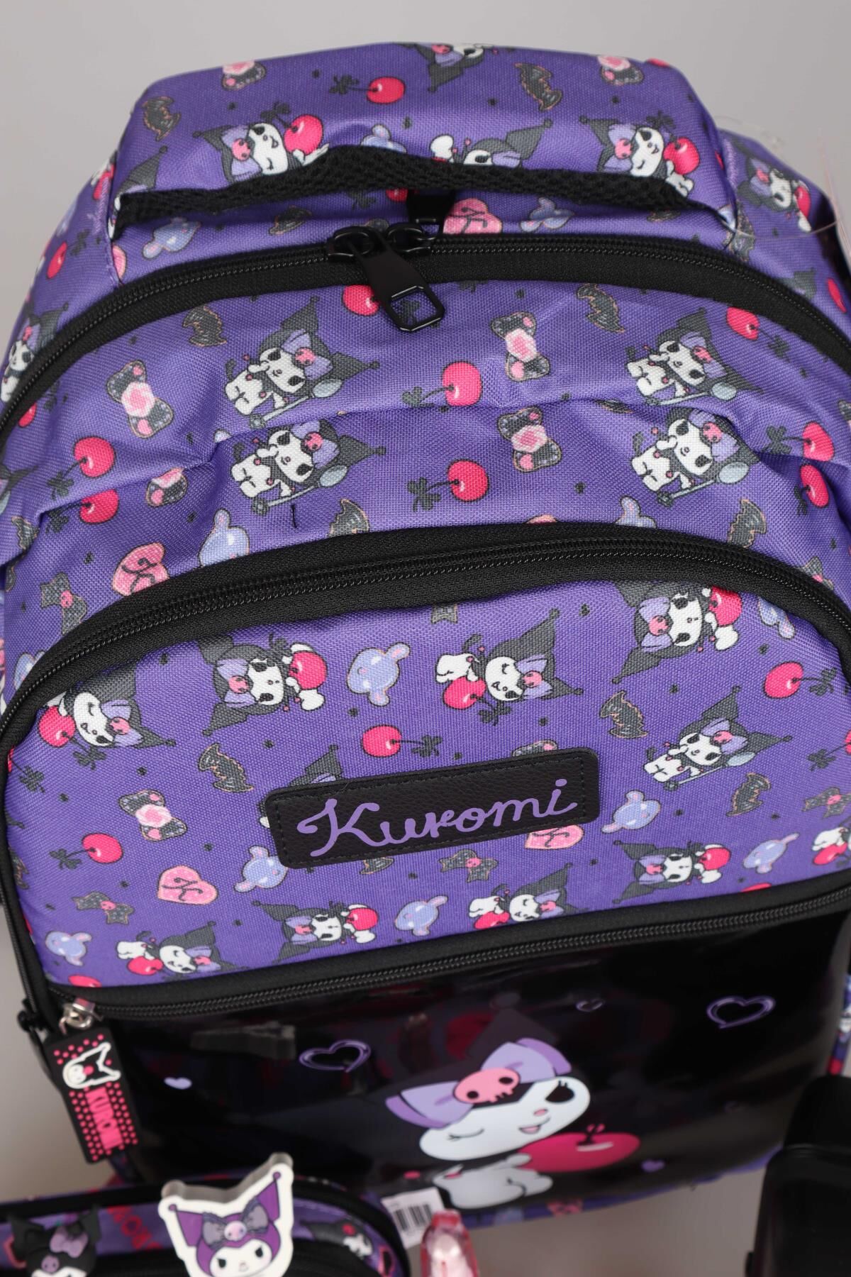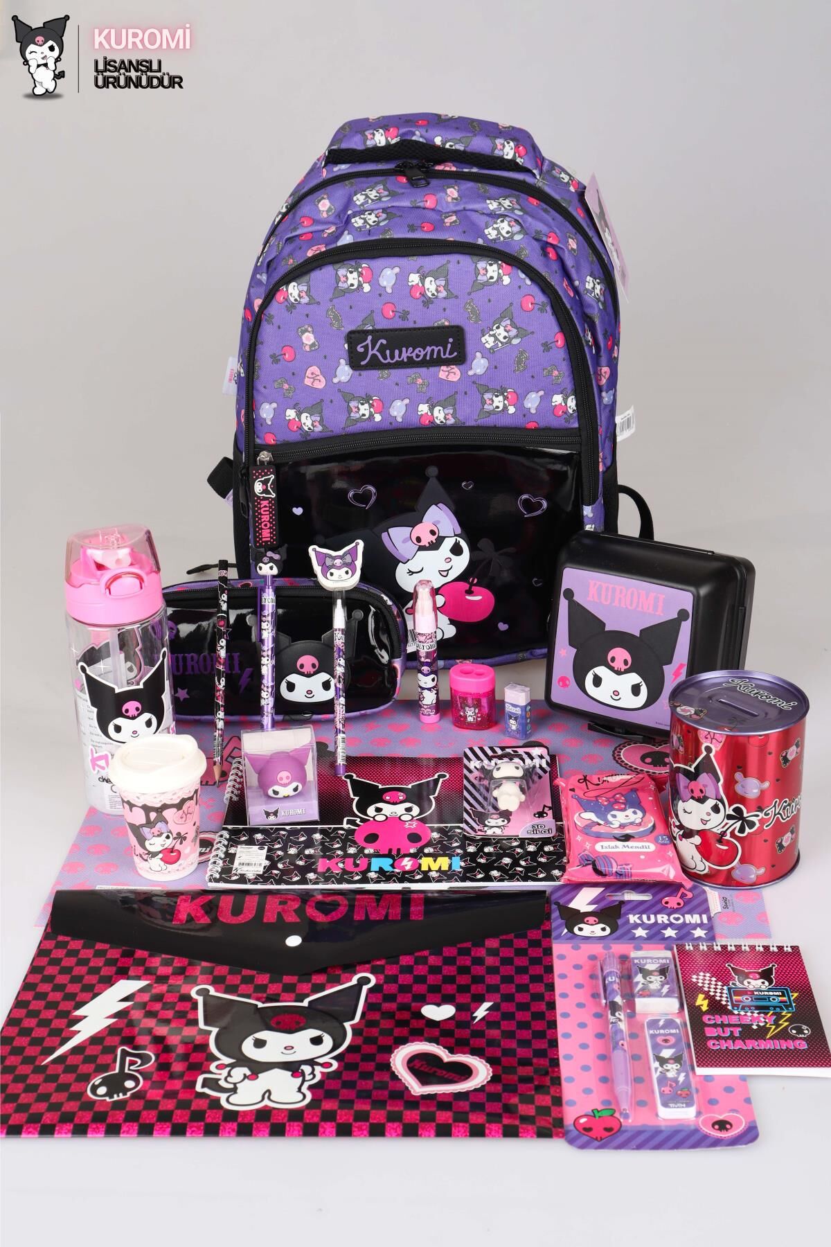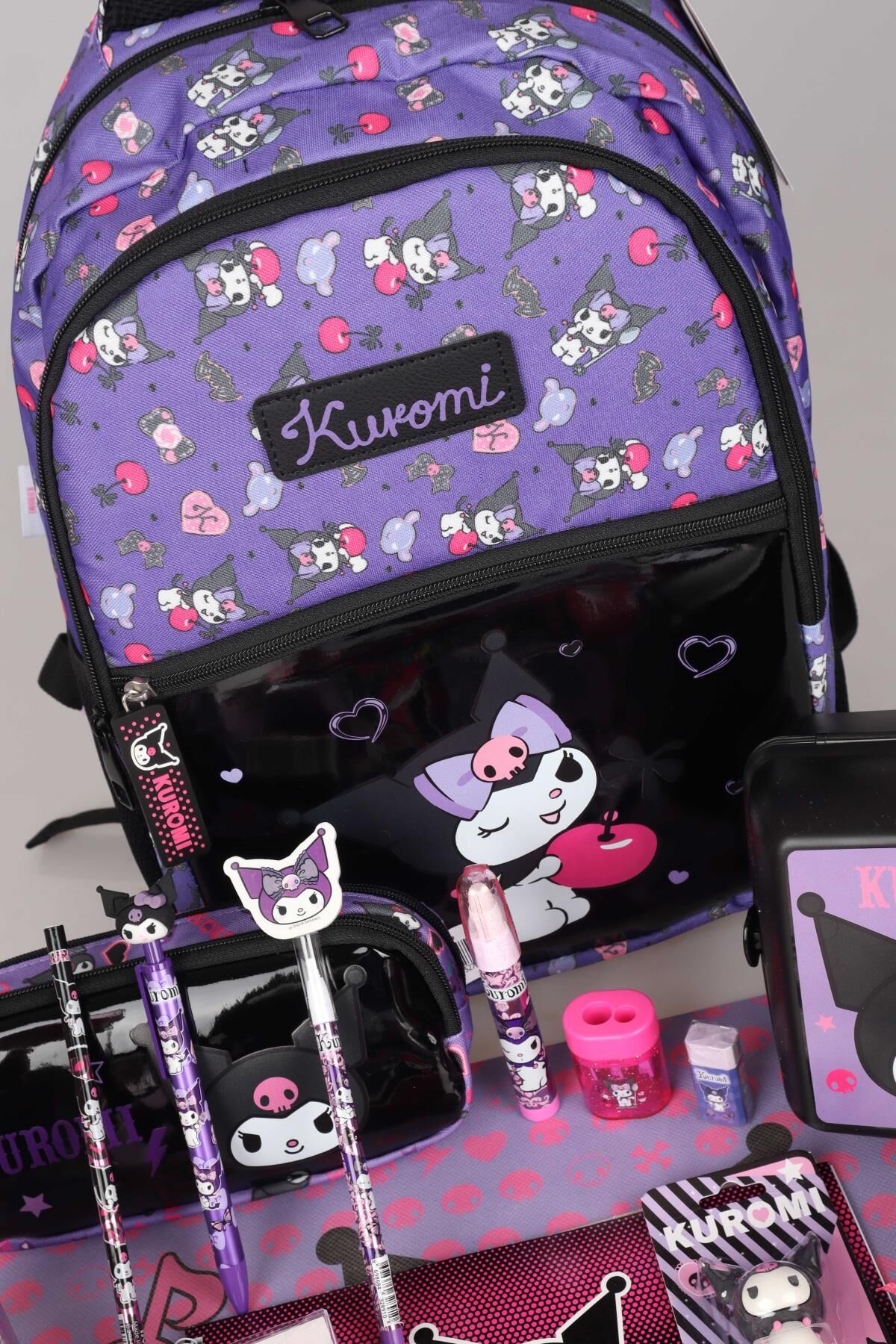 YENİ SEZON LİSANSLI KUROMI ''CHERRY'' ÖZEL KOLEKSİYON FULL PREMIUM OKUL ÇANTASI,BESLENME KABI,KALEM ÇANTASI VE 500 ML MATARA,BESLENME ÖRTÜSÜ,KIRTASİYE OKUL SETİ