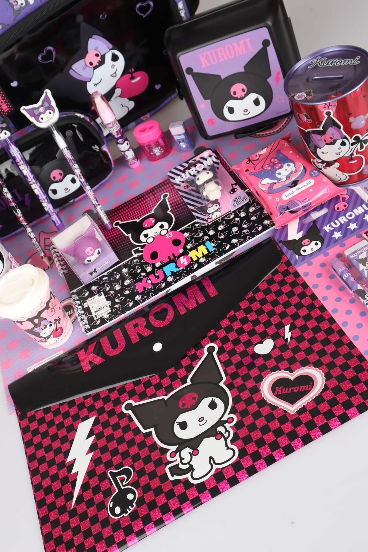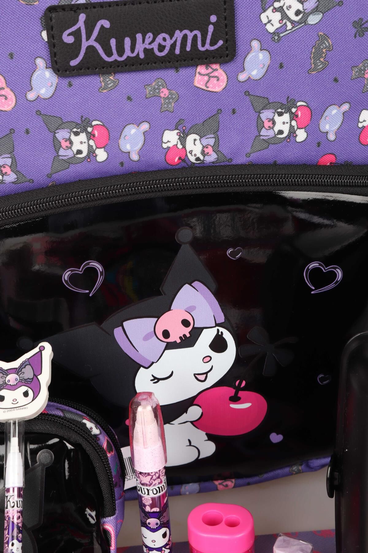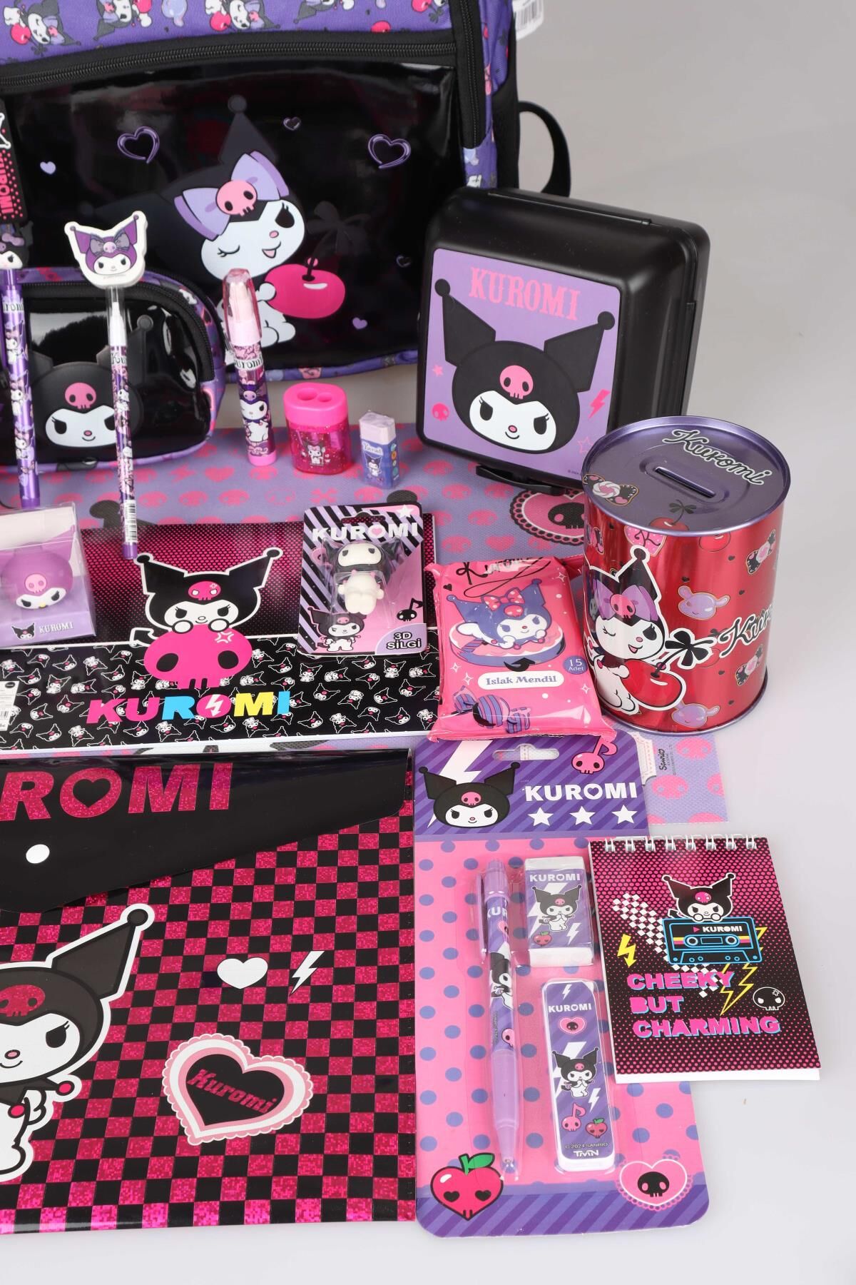 YENİ SEZON LİSANSLI KUROMI ''CHERRY'' ÖZEL KOLEKSİYON FULL PREMIUM OKUL ÇANTASI,BESLENME KABI,KALEM ÇANTASI VE 500 ML MATARA,BESLENME ÖRTÜSÜ,KIRTASİYE OKUL SETİ