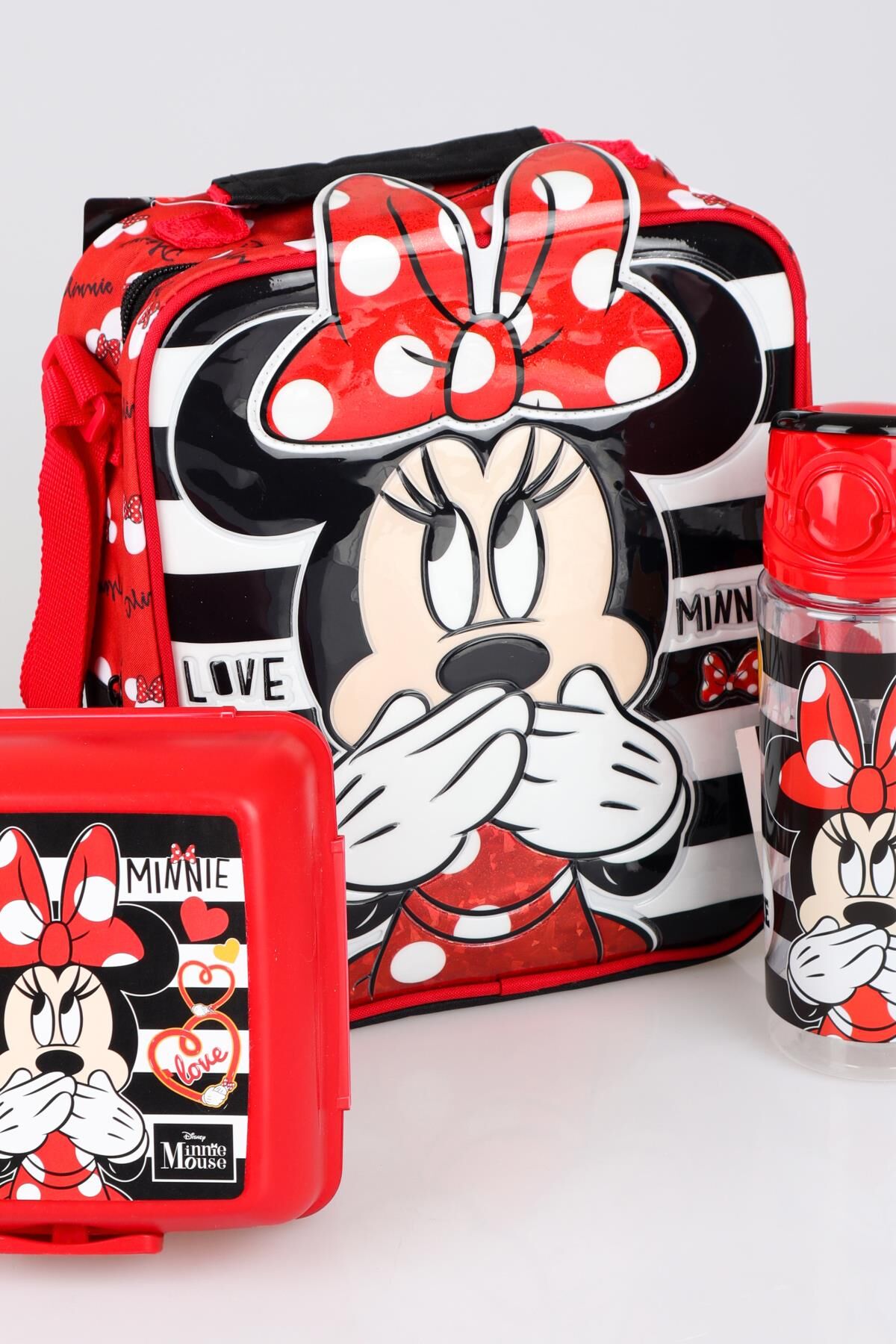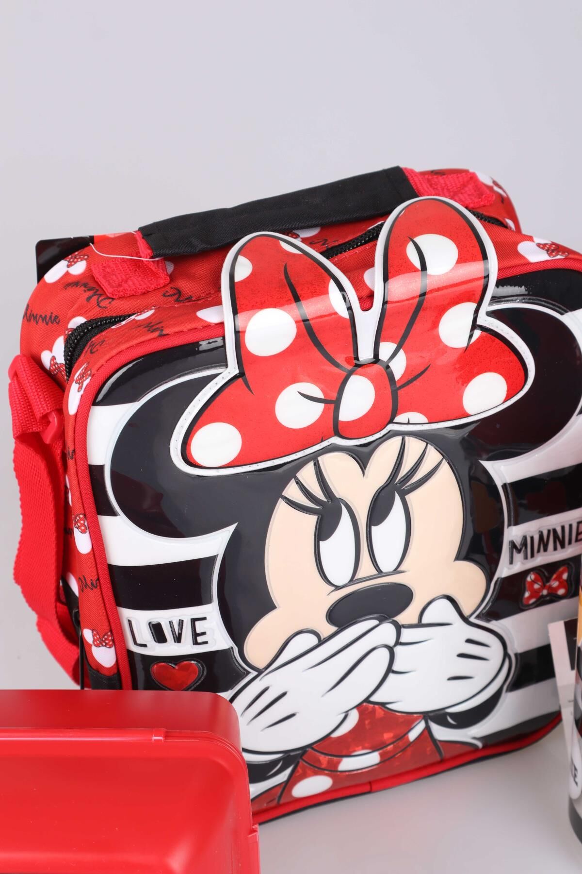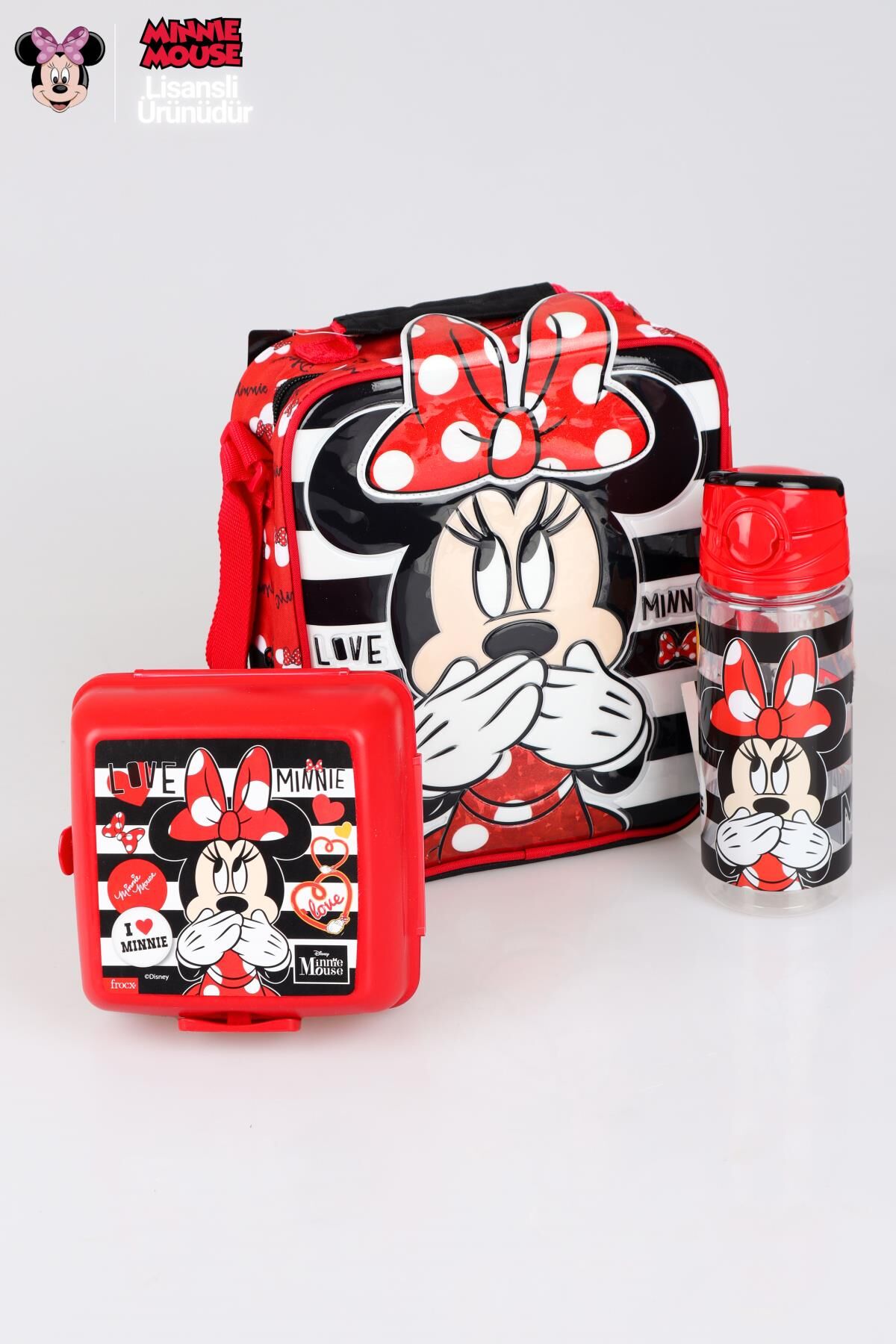 YENİ SEZON LİSANSLI MINNIE MOUSE BESLENME ÇANTASI,BESLENME KABI VE TRITAN MATARA 500 ML BESLENME SETİ